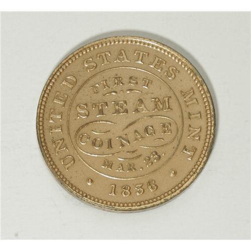 <B>Two U.S. Mint Medals.</B></I> Consists of: <B>1836 First Steam Coinage Medal,</B></I> original 1836 first steam press coinage by C. Gobrecht, Uncirculated, red, rare; and a <B>(ca. 1900) U.S. Mint Restrike Medal,</B></I> designed by Paquet, Uncirculated, the original is a beautiful medal, well struck with vibrant mint shimmer, this design commemorated the first steam coinage on March 23, 1836. Julian states, "The original medals struck in 1836 had die break at 6:30 and used the reverse die of Feb. 22 with Mar. 23 punched over Feb. 22."<BR><BR><b>Shipping:</b> Coin/Currency (<a target="_blank" href="http://www.heritageauctions.com/common/shipping.php">view shipping information</a>)