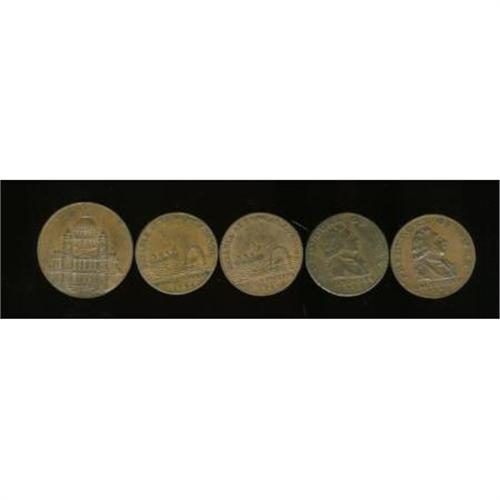 <B>Group Lot Five British Conder Tokens of Middlesex, Uncertified.</B></I> Includes: DH-39, 1794, "Coin Dealer"; DH-306, 1794, "I. Fowler's" (two pieces); DH-985, 1795, George III (two pieces). <BR><BR><b>Shipping:</b> Coins & Currency (<a target="_blank" href="http://www.heritageauctions.com/common/shipping.php">view shipping information</a>)