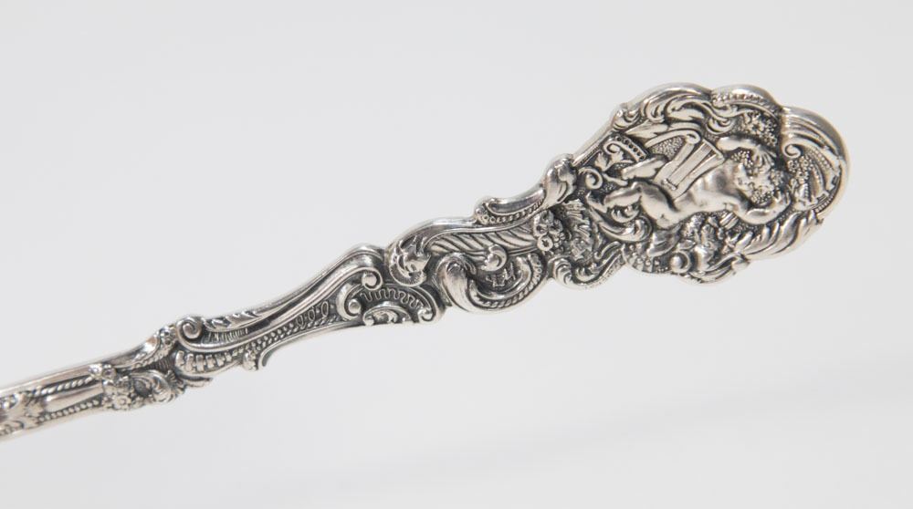 Including 5 serving pieces - 3 forks, spork, & stuffing spoon, 3 fish forks, 3 pickle forks, 2 sporks, 2 grapefruit spoons, and 1 teaspoon. 16 pieces. Approx. 26 ozt.