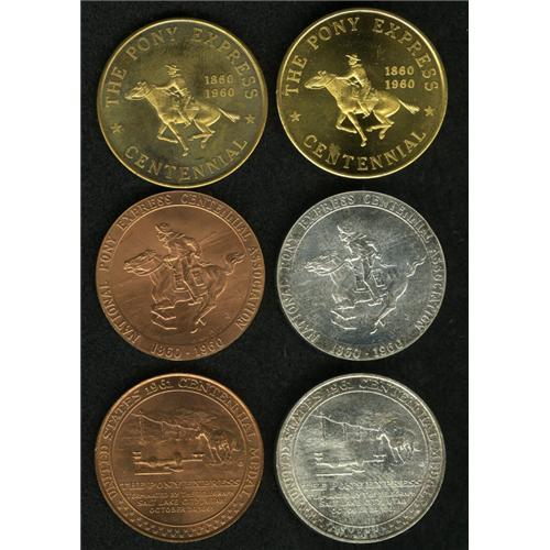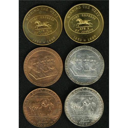 <B>Group Lot of Pony Express So-Called Dollars.</B></I> Included are HK-582 (silver), HK-583 (bronze), HK-585 (gilt bronze, two pieces), HK-588 (silver), and HK-589 (bronze). All pieces are Gem Uncirculated. Viewing is recommended.