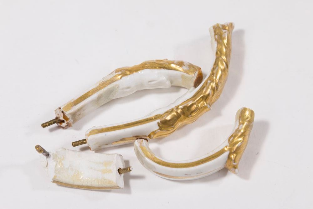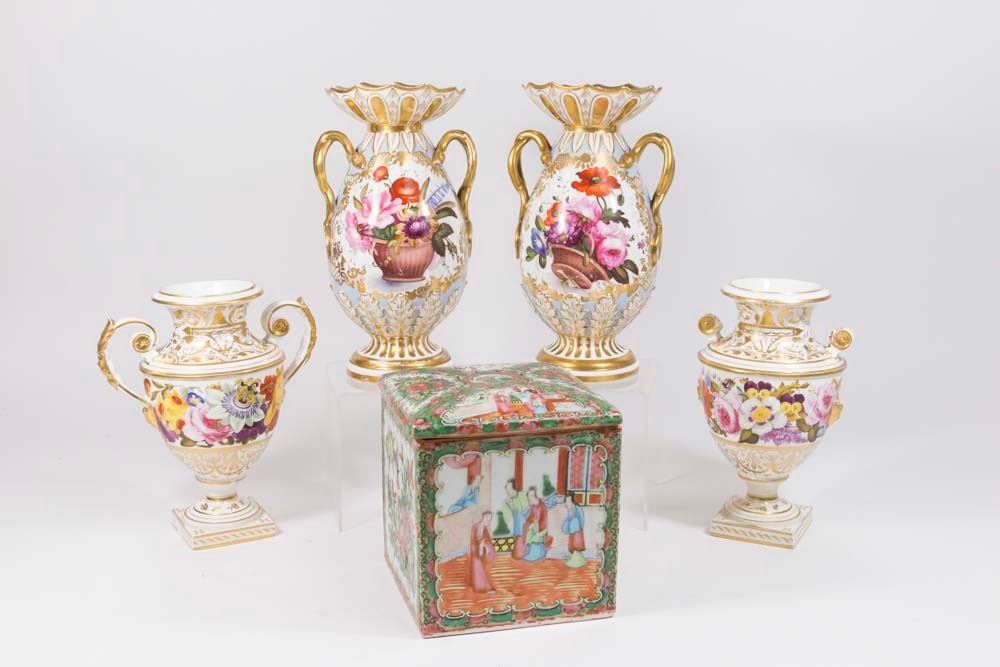 Including Chinese covered box and 2 pairs of gilt-decorated vases. Taller pair approx. 10 1/2" H. All pieces with damage.