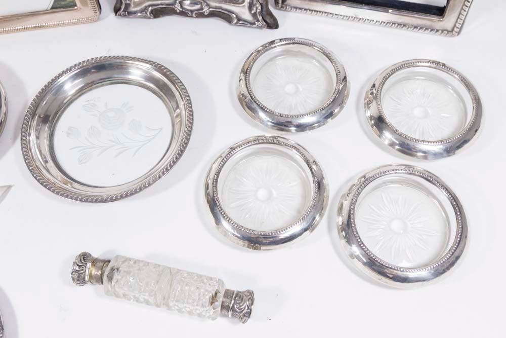 Including glass coasters with sterling rims, mirrors, picture frames, cake server, perfumer, vase, and Tiffany spoons. 17 pieces.