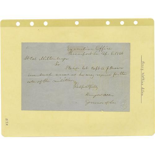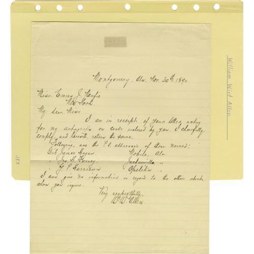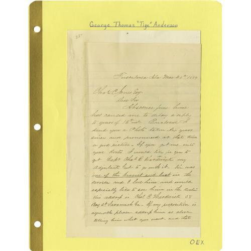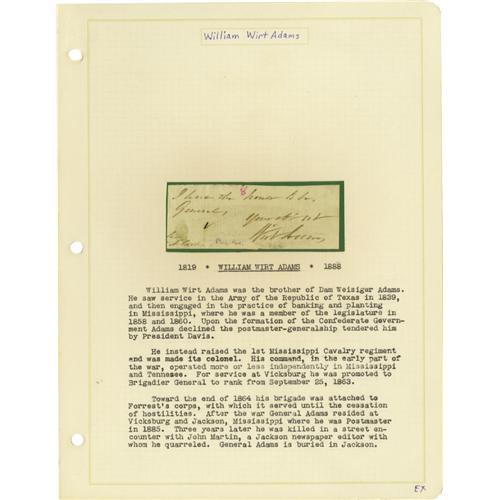 <B>Group Lot of Ten Confederate Generals' Autographs</B></I> consisting of: <BR><B>Wm. Wirt Adams</B></I>- Clipped signature with several words. <BR><B>Henry Watkins Allen</B></I>- April 6, 1864 note as governor of Louisiana. <BR><B>William Wirt Allen</B></I>- 1890-dated ALS. <BR><B>George Burgwyn Anderson</B></I>- Large, bold clipped signature. <BR><B>Geo. Thomas Anderson</B></I>- 1887 ALS regarding his Civil War adjutant, "<I>...one of the bravest & best in the service.</B></I>" <BR><B>James Patton Anderson</B></I>- Clipped signature with his rank below. <BR><B>Joseph Reid Anderson</B></I>- Clipped signature with several words. <BR><B>Richard Heron Anderson</B></I>- Trimmed war-date endorsement note. Temporarily commanded Longstreet's Corps when he was wounded in 1864. <BR><B>Robert Houstoun Anderson</B></I>- Trimmed endorsement note. <BR><B>Samuel Read Anderson</B></I>- Small longhand note, possibly a trimmed endorsement.<BR><BR><b>Shipping:</b> Small Flat (<a target="_blank" href="http://www.heritageauctions.com/common/shipping.php">view shipping information</a>)