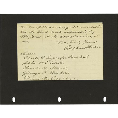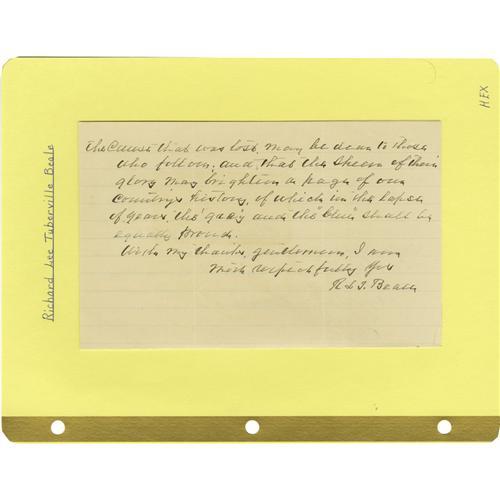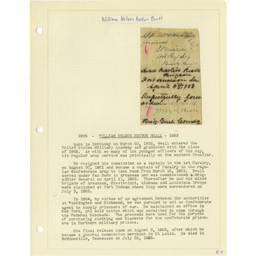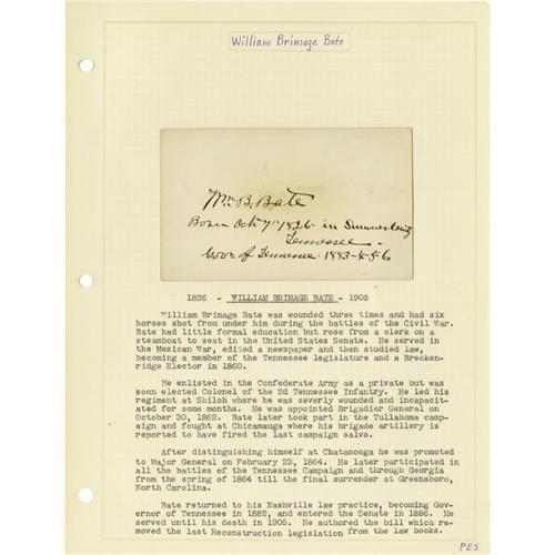 <B>Group Lot of Ten Confederate Generals' Autographs</B></I> consisting of: <BR><B>Frank C. Armstrong</B></I>- Nice signature card with "<I>Brig. General Forrest's Cavalry Corps C.S.A.</B></I>" below. <BR><B>James J. Archer</B></I>- Fine three page 1855 ALS, written to President Pierce recommending someone for an officer's appointment. He gives a long history of the family's service in the Revolutionary War. Nice item. <BR><B>Alphaeus Baker</B></I>- Two page 1887 ALS on his law firm stationery. <BR><B>Terrence Simmons Baker</B></I>- 1891 ALS with Civil War content. <BR><B>Rufus Barringer</B></I>- 1871 ALS on his law firm stationery. <BR><B>John Decatur Barry</B></I>- Clipped signature. <BR><B>Seth Maxwell Barton</B></I>- Small handwritten note. <BR><B>William Brimage Bate</B></I>- Nice autograph card with his birth info and "<I>Gov. of Tennessee 1883-4-5-6.</B></I>". Bate was wounded three times and had six horses shot our from under him. <BR><B>Richard Lee Turberville Beale</B></I>- Nice handwritten note with Civil War content. <BR><B>William Nelson Rector Beall</B></I>- Short handwritten notation.<BR><BR><b>Shipping:</b> Small Flat (<a target="_blank" href="http://www.heritageauctions.com/common/shipping.php">view shipping information</a>)