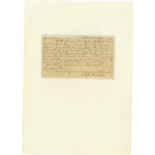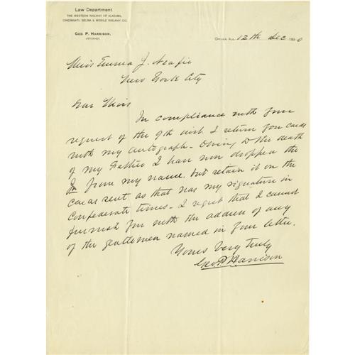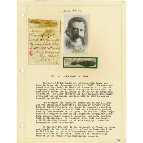 <B>Group Lot of Ten Confederate Generals' Autographs</B></I> consisting of: <BR><B>Joseph L. Brent</B></I>- Signed cabinet photo. <BR><B>George P. Harrison</B></I>- 1890 ALS on his law firm stationery. <BR><B>Sydney Jackerman</B></I>- 1882 handwritten note on a postal card. <BR><B>William H. King</B></I>- Signature card with rank below. <BR><B>W. R. Miles</B></I>- 1883 ALS. <BR><B>Thomas Taylor Munford</B></I>- Undated ALS responding to request for his autograph as a "Confederate Cavalry Officer." One stain mark. <BR><B>Pierre Soule</B></I>- Large, bold clipped signature. <BR><B>James Webb Throckmorton</B></I>- Clipped signature with letter closing. A couple of stain marks. <BR><B>Daniel Weissiger Adams</B></I>- 1872 ALS. <BR><B>John Adams</B></I>- Small, war-dated note conveying orders. Stained at top.<BR><BR><b>Shipping:</b> Small Flat (<a target="_blank" href="http://www.heritageauctions.com/common/shipping.php">view shipping information</a>)