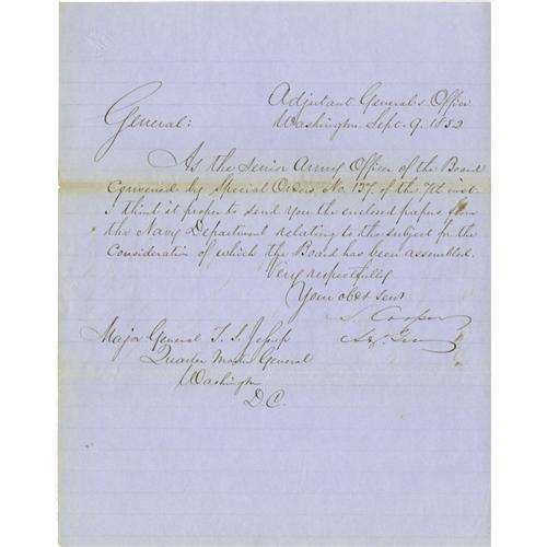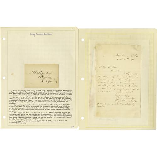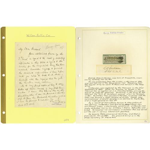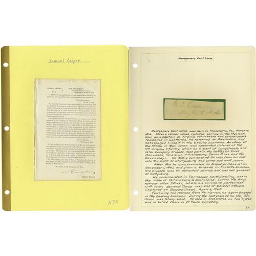 <B>Group Lot of Ten Confederate Generals' Autographs</B></I> consisting of: <BR><B>Thomas James Churchill</B></I>- Nice 1891 ALS. Churchill was elected governor of Arkansas in 1880. <BR><B>Philip Cook</B></I>- Nice autograph card with his rank and reference to "<I>Jackson's Corps</B></I>". <BR><B>John Rogers Cooke</B></I>- 1873 ALS with Civil War content. Cooke was wounded seven times before being promoted to brigadier general. <BR><B>Samuel Cooper</B></I>- Signed printed 1854 War Department General Order #4 (also with a printed signature of Jefferson Davis as secretary of war). Cooper was the highest ranking Confederate officer and fled with Davis when Richmond fell. A scarce signature. <BR><B>Samuel Cooper</B></I>- 1852 ALS as adjutant general of the army, to General Jessup about routine army business. <BR><B>Montgomery Dent Corse</B></I>- Clipped signature with his rank below. <BR><B>Geo. Blake Cosby</B></I>- Autograph card with his rank below. <BR><B>Wm. Ruffin Cox</B></I>- 1890-dated autograph card. <BR><B>Geo. Bibb Crittenden</B></I>- Clipped signature with his rank below. <BR><B>Henry Brevard Davidson</B></I>- Autograph card with "<I>Danville, California</B></I>" (his later home) below.<BR><BR><b>Shipping:</b> Small Flat (<a target="_blank" href="http://www.heritageauctions.com/common/shipping.php">view shipping information</a>)
