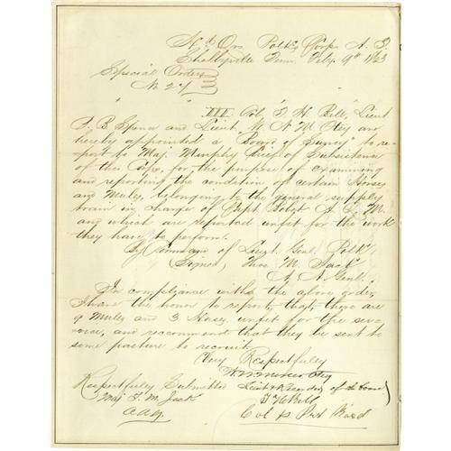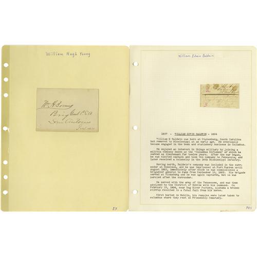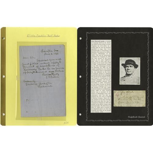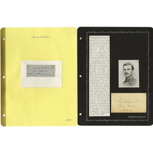<B>Group Lot of Ten Confederate Generals' Autographs</B></I> consisting of: <BR><B>Wm. H Young</B></I>- Autograph card with rank and "<I>San Antonio, Texas</B></I>". <BR><B>Tyree H. Bell</B></I>- Beautiful handwritten "Special Order No. 24," written at Polk's HQ at Shelbyville, Tennessee, February 9, 1863 authorizing inspection of the horses and mules in the general supply train. Bell has endorsed it at the bottom with his (then) rank of colonel. Nice. <BR><B>Wm. E. Baldwin</B></I>- Clipped signature with his rank from war-period endorsement. Killed in service by a fall from his horse February 19, 1864 near Dog River Factory, Alabama. A scarce signature. <BR><B>Lucius M. Walker</B></I>- Clipped signature. <BR><B>John H. Winder</B></I>- Clipped signature, signed with his (then) rank of lieutenant dated 1823. One of the oldest Confederate generals (born 1800), he commanded the notorious Libby Prison. <BR><B>Elisha F. "Bull" Paxton</B></I>- A very scarce autograph. Paxton was part of the famed Stonewall Brigade. Killed on the first day of Chancellorsville, he was buried in the yard of the house where Jackson died shortly thereafter. <BR><B>Peter B. Starke</B></I>- Clipped signature from a ward-dated document, November 13, 1862. <BR><B>Thomas B. Smith</B></I>- Autograph card with rank. <BR><B>James Deshler</B></I>- Clipped signature with his (then) rank of lieutenant in the U.S. Army. Killed in action at Chickamauga. Very scarce. <BR>Preston Smith<B></B></I>- Clipped signature. Another Chickamauga casualty, and also a very scarce signature.<BR><BR><b>Shipping:</b> Small Flat (<a target="_blank" href="http://www.heritageauctions.com/common/shipping.php">view shipping information</a>)