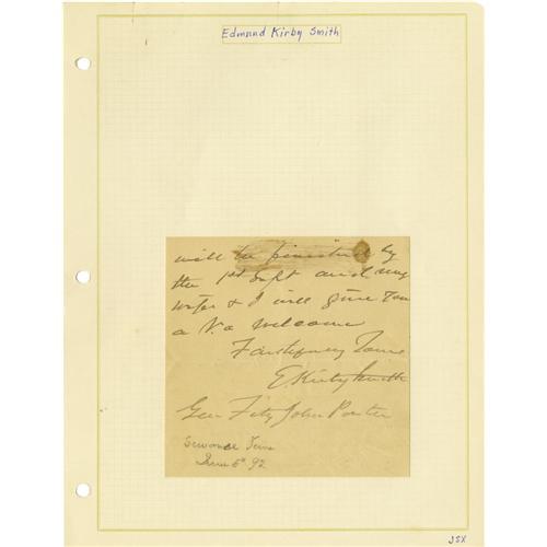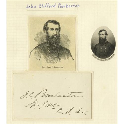 <B>Group Lot of Three Confederate Generals' Autographs</B></I> consisting of: <BR><B>E. Kirby Smith</B></I>- 1892 signed longhand note. <BR><B>John C. Pemberton</B></I>- Autograph card with rank below. <BR><B>Earl Van Doren</B></I>- Clipped signature with (then) rank of major- cavalry below. <BR>All three are "premium" autographs, scarce and seldom seen.<BR><BR><b>Shipping:</b> Small Flat (<a target="_blank" href="http://www.heritageauctions.com/common/shipping.php">view shipping information</a>)