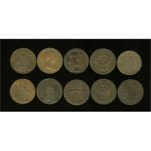 <B>Group Lot of 10 British Conder Tokens, Uncertified. </B></I> Ten copper Conder tokens dated from 1789 to 1794. The average grade is VF. Some of the pieces show corrosion. Included are a pair of 1789 Cronebane halfpenny tokens made from Irish copper. <BR><BR><b>Shipping:</b> Coins & Currency (<a target="_blank" href="http://www.heritageauctions.com/common/shipping.php">view shipping information</a>)
