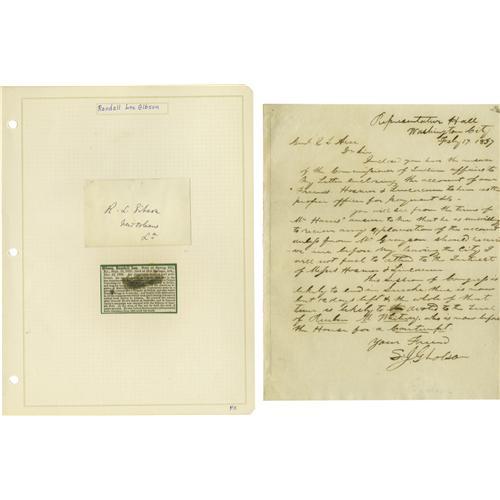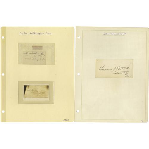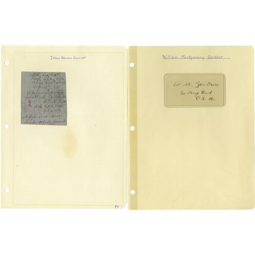 <B>Group Lot of Ten Confederate Generals' Autographs</B></I> consisting of:<BR><B>William M. Gardner</B></I>- Autograph card with his rank below.<BR><B>Isham W. Garrott</B></I>- Clipped war-date April 9, 1863 endorsement, signed with his then-rank of colonel below. A scarce signature.<BR><B>Lucius J. Gartrell</B></I>- Autograph card with "<I>Atlanta, Ga.</B></I>" below.<BR><B>Martin W. Gary</B></I>- Clipped signature. <BR><B>Richard C. Gatlin</B></I>- CDV signed on front. Original notation on reverse explains how the autograph was obtained in 1888. Sanders lists no price for a signed photo, indicating no available examples.<BR><B>Samuel J. Gholson</B></I>- 1837 ALS as member of Congress. References Indian Affairs. <BR><B>Randall L. Gibson</B></I>- Autograph card with "<I>New Orleans, La</B></I>" below. <BR><B>Jeremy F. Gilman</B></I>- Faded, but readable clipped signature.<BR><B>Jeremy F. Gilman</B></I>- A fine two-sided 1854 ALS as a U. S. Army captain, on military subjects. Gilman was Albert Sydney Johnston's chief engineer, and was considered the best military engineer.<BR><B>Adley Hogan Gladden</B></I>- Clipped signature with rank from war-dated 1861 military document. Gladden's is a tough signature; he died of wounds received at Shiloh, 1862.<BR><BR><b>Shipping:</b> Small Flat (<a target="_blank" href="http://www.heritageauctions.com/common/shipping.php">view shipping information</a>)
