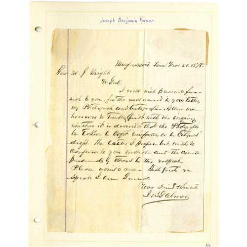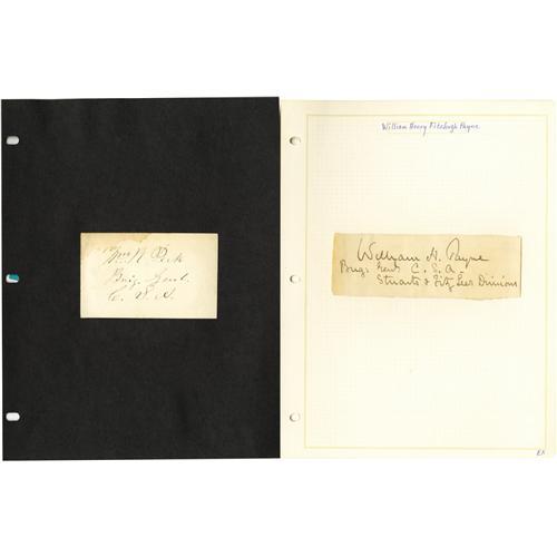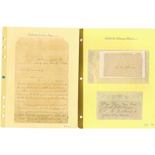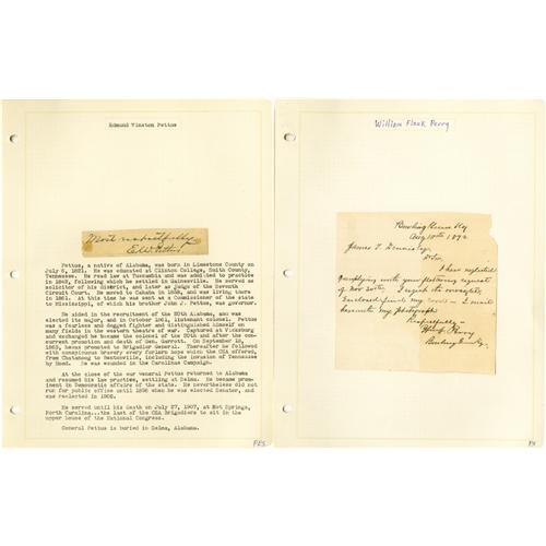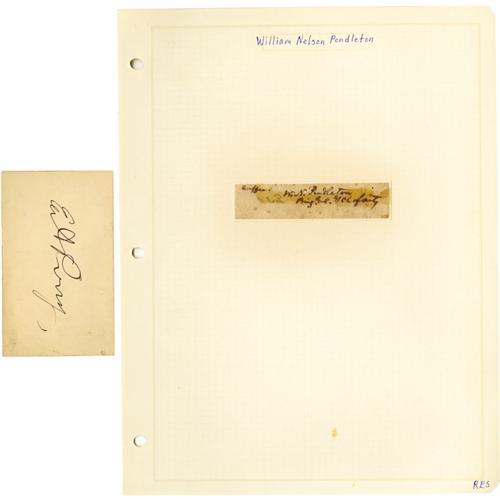 <B>Group Lot of Ten Confederate Generals' Autographs</B></I> consisting of: <BR><B>Edward A. O'Neal</B></I>- Two documents: Autograph card & a clipped signature with eight words plus rank. <BR><B>Richard L. Page</B></I>- 1893 ALS all about C.W. comrades. <BR><B>Joseph B. Palmer</B></I>- 1878 ALS to General W.J. Wright, agreeing to furnish him at his request his photograph and autograph book. <BR><B>William H.F. Payne</B></I>- Clipped signature with his rank and "<I>Stuart's & Fitz Lee's Division</B></I>." <BR><B>William R. Peck</B></I>- Autograph card with rank. <BR><B>William N. Pendleton</B></I>- Clipped signature with rank <BR><B>Edward A. Perry</B></I>- Autograph card. <BR><B>William F. Perry</B></I>- 1892 ALS. <BR><B>Edmund W. Pettus</B></I>- Clipped signature. Elected to the U.S. Senate from Alabama in 1896, he served until his death in 1907, the last of the CSA Brigadiers to sit in the Senate. <BR><B>Albert Pike</B></I>- Autograph card dated "<I>Washington, Oct. 10, 1889</B></I>."<BR><BR><b>Shipping:</b> Small Flat (<a target="_blank" href="http://www.heritageauctions.com/common/shipping.php">view shipping information</a>)