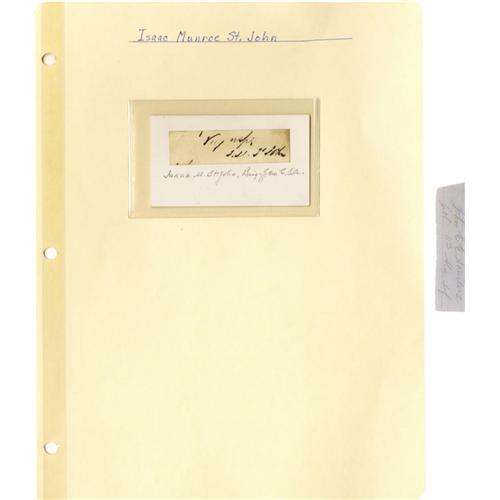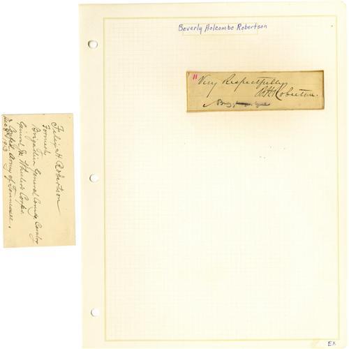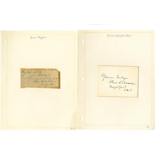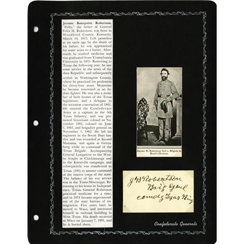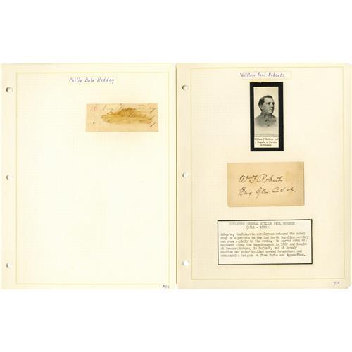 <B>Group Lot of Ten Confederate Generals' Autographs</B></I> consisting of: <BR><B>William P. Roberts</B></I>- Autograph card with rank. <BR><B>Beverly H. Robertson</B></I>- Clipped signature with rank added later. <BR><B>Felix H. Robertson</B></I>- 1913-dated autograph card with rank & "<I>Gen. Joseph Wheelers Corps, Confed. Army of Tennessee</B></I>." <BR><B>Jerome P. Robertson</B></I>- Clipped signature with rank & "<I>Comdg Texas Brig.</B></I>" Wouned at Second Manassas & Gettysburg. <BR><B>Phillip D. Roddey</B></I>- Clipped signature with then-rank of colonel. <BR><B>Thomas Rosser</B></I>- Autograph card with rank. <BR><B>Daniel Ruggles</B></I>- War-period clipped signature with rank. <BR><B>Albert Rust</B></I>- Autograph with "<I>Little Rock, Ark.</B></I>" <BR><B>Isaac M. St. John</B></I>- Clipped signature. <BR><B>John C.C. Sanders</B></I>- Clipped signature with then-rank of colonel.<BR><BR><b>Shipping:</b> Small Flat (<a target="_blank" href="http://www.heritageauctions.com/common/shipping.php">view shipping information</a>)