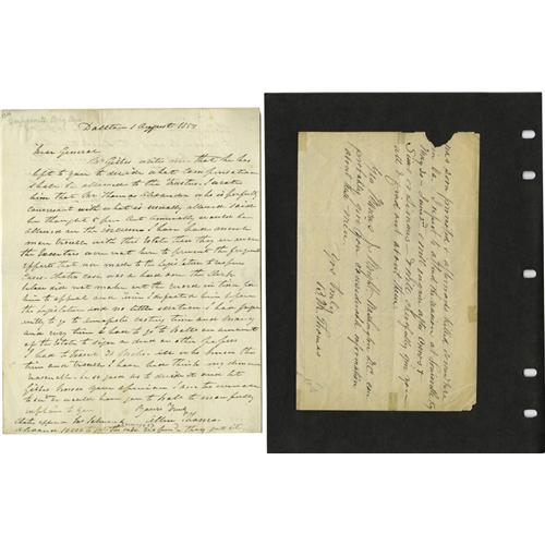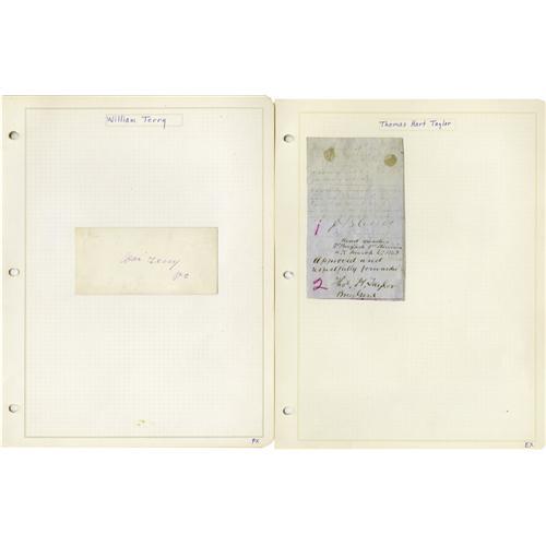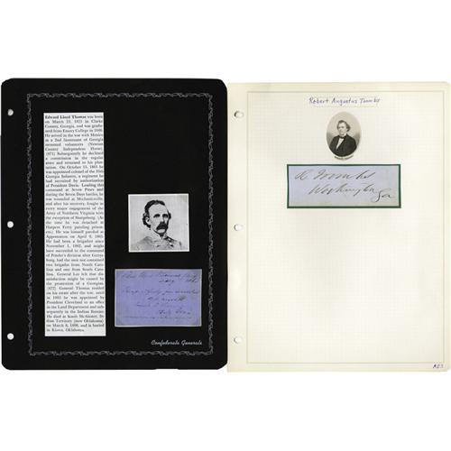 <B>Group Lot of Ten Confederate Generals' Autographs</B></I> consisting of:<BR><B>William B. Taliaferro</B></I> Autograph card with rank.<BR><B>Jas. C. Tappan</B></I>- Clipped signature.<BR><B>Thomas H. Taylor</B></I>- Nice bold signature with rank on a clipped endorsement, dated Mar. 6,1863.<BR><B>William Terry</B></I>- Autograph card.<BR><B>William R. Terry</B></I>- War period signature on clip from a list of unit officers.<BR><B>Allen Thomas</B></I>- Full page 1857 ALS, written to General Columbus O'Donnell (?) regarding legal matter.<BR><B>Bryan M. Thomas</B></I>- 1900 ALS, two sides, all with Civil War content.<BR><B>Edwin L. Thomas</B></I>- May 5, 1863-dated clip from a military document , signed with rank.<BR><B> Robert A.Toombs</B></I>- Autograph with "<I>Washington, La.</B></I>" below.<BR><BR><b>Shipping:</b> Small Flat (<a target="_blank" href="http://www.heritageauctions.com/common/shipping.php">view shipping information</a>)