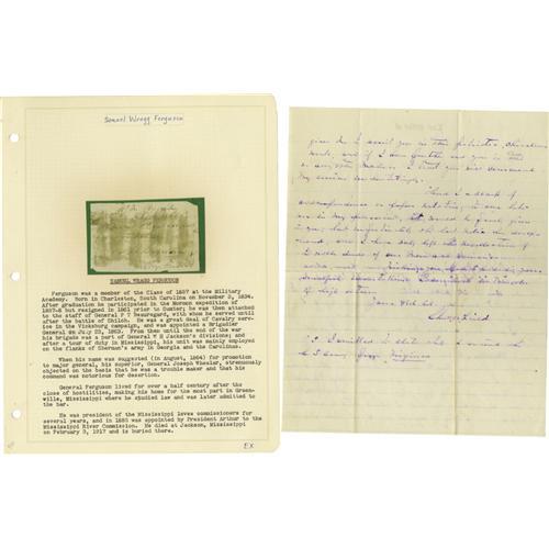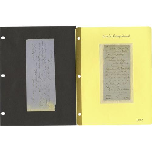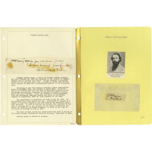 <B>Group Lot of 11 Confederate Generals' Autographs</B></I> consisting of:<BR><B>John Echols</B></I>- Clipped signature with his rank below.<BR><B>John Dunovant</B></I>- Killed in action at Vaughn Road, 8 ½" x 11" C.S. A. requisition form for "<I>sergeants swords</B></I>", undated. Signed with his then-rank of major. A rare autograph; Sanders lists only a signature, no higher forms.<BR><B>John Echols</B></I>- A war-date of Dec. 1, 1864 endorsement on an application for clearance to convey supplies to Lynchburg.<BR><B>Stephen Elliot, Jr</B></I>- Nice signed note.<BR><B>Arnold Elzey (Jones)</B></I>- War-dated June 5, 1863 signed endorsement, with his rank below, on a document regarding military communication.<BR><B>Clement A. Evans</B></I>- Trimmed note, signed. Evans was Commander-in-Chief of the United Confederate Veterans when he died in 1911.<BR><B>James F. Fagan</B></I>- Clipped signature with his rank below.<BR><B>John H. Forney</B></I>- 1894 ALS.<BR><B>Winfield Scott Featherstone</B></I>-Clipped signature with his rank below. Two stain marks.<BR><B>Samuel W. Ferguson</B></I>- Clipped signed July 16, 1864 endorsement, with his rank below. Stained.<BR><B>Charles W. Field</B></I>- Two sided 1887 ALS.<BR><BR><b>Shipping:</b> Small Flat (<a target="_blank" href="http://www.heritageauctions.com/common/shipping.php">view shipping information</a>)