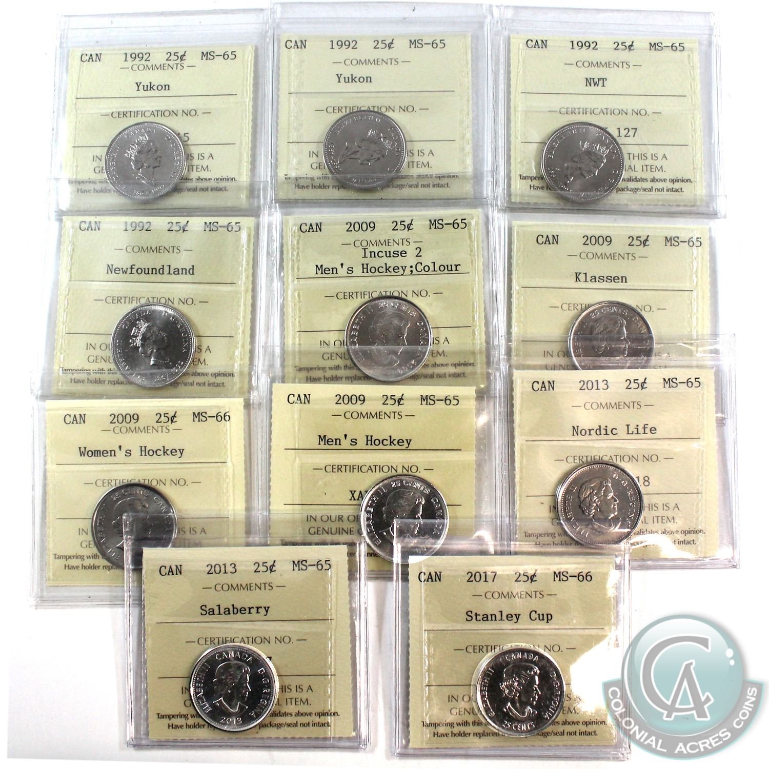 Group Lot of 11x Commemorative 1992-2017 Canada 25-cent ICCS Certified - 2x 1992 Yukon MS-65, 1992 NWT MS-65, 1992 Newfoundland MS-65, 2009 Men's Hockey Colour; Incuse 2 MS-65, 2009 Klassen MS-65, 2009 Women's Hockey MS-66, 2009 Men's Hockey MS-65, 2013 Nordic Life MS-65, 2013 Salaberry MS-65 & 2017 Stanley Cup MS-66. 11pcs