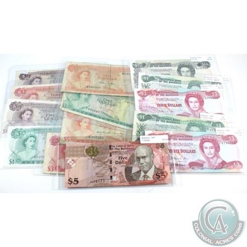 Group Lot of 14 Different Banknotes from the Bahamas. The notes range in date from 1965 to 2007.