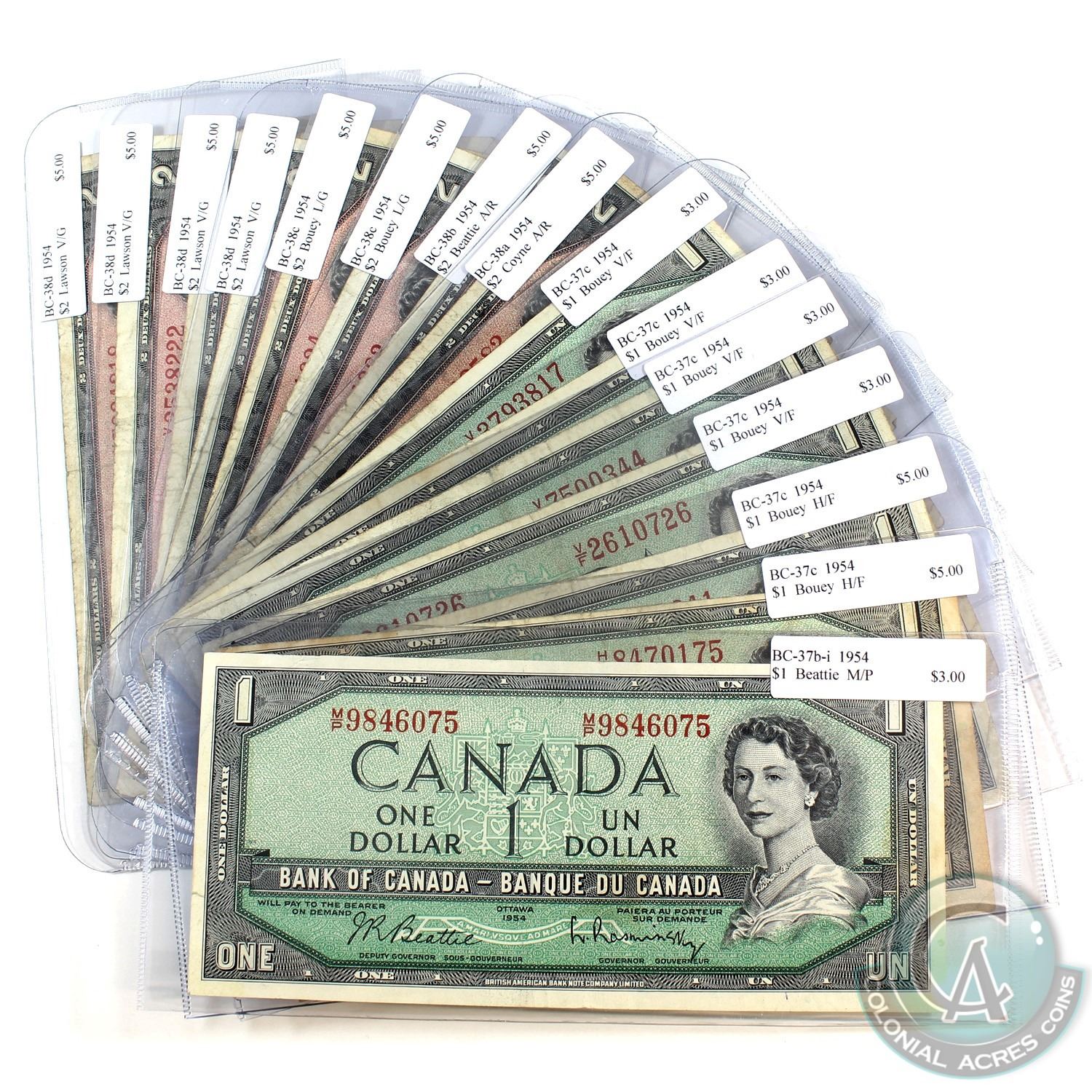 Group Lot of 15x 1954 Bank of Canada Modified Portrait Notes. You will receive 1x $1 BC-37b-i, 6x $1 BC-37c, 1x $2 BC-38a, 1x $2 BC-38b, 2x $2 BC-38c & 4x $2 BC-38d. Please note each signature combination has almost all the same prefix. 15pcs