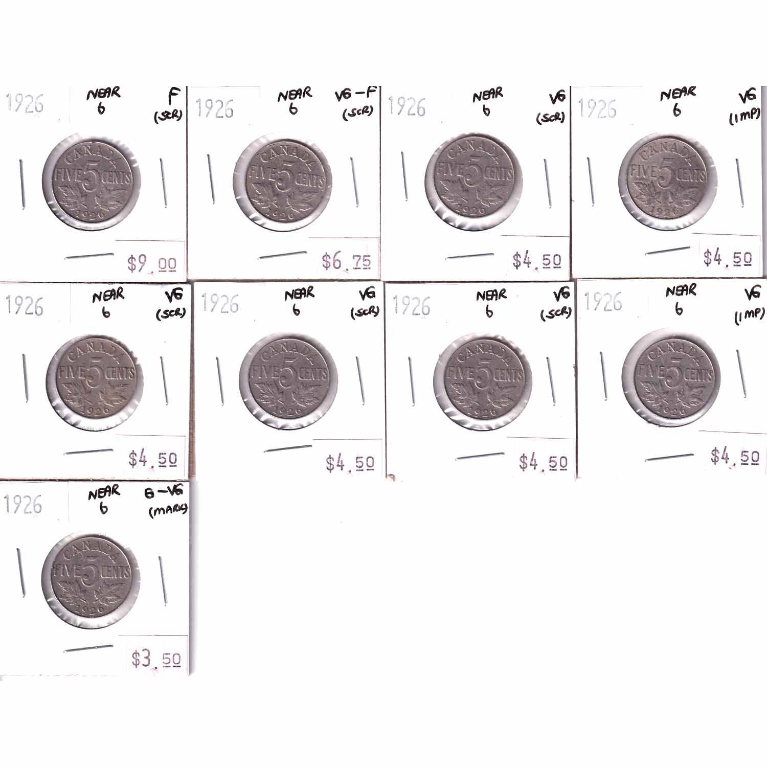 Group Lot of 1926 Canada 5-cent Near 6 - G-VG, 6x VG, VG-F & Fine. Coins contain various impairments. 9pcs