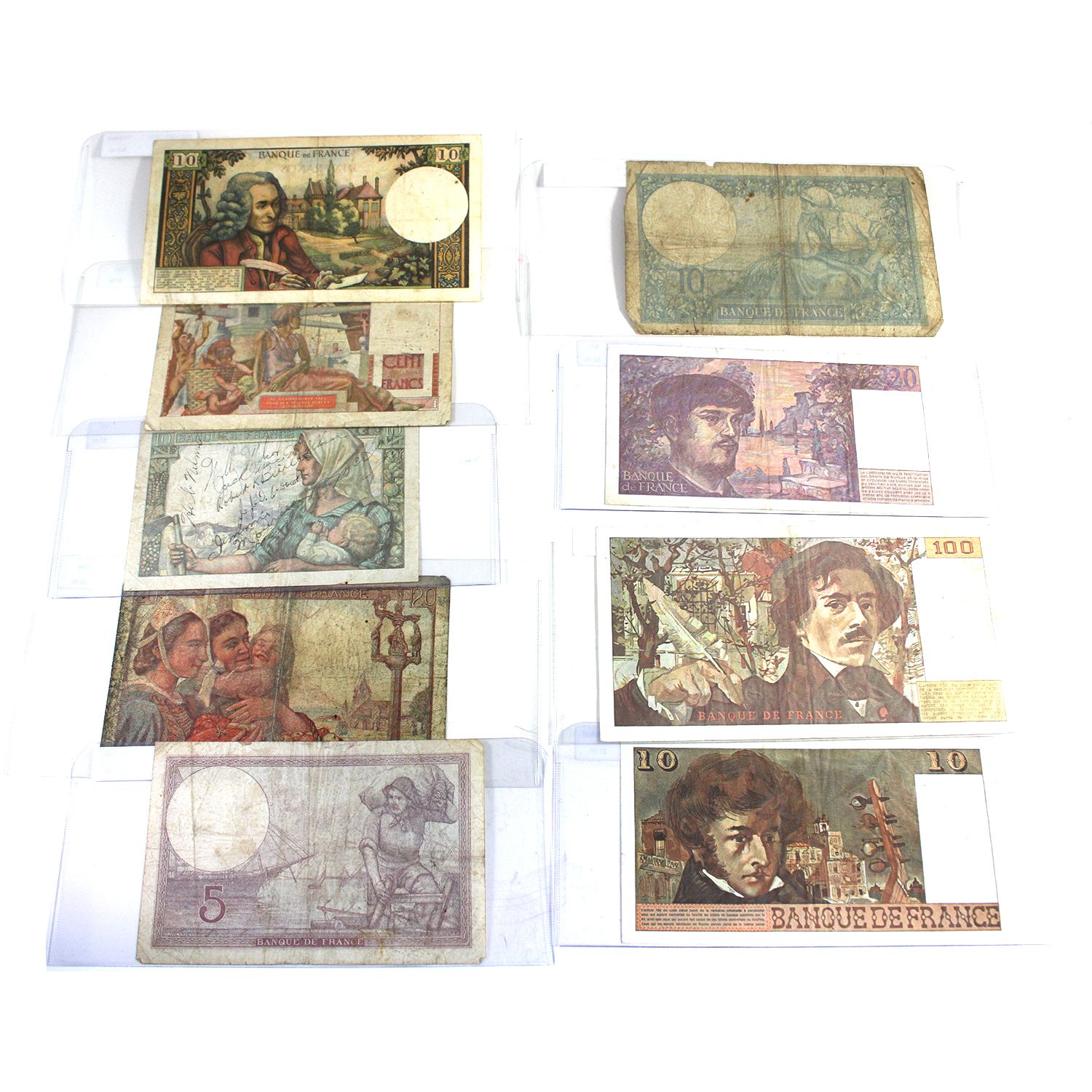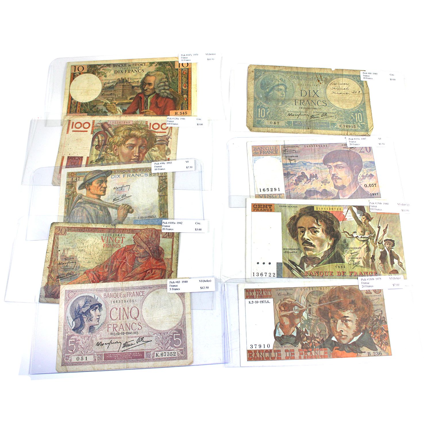 Group Lot of 1940-1997 France Mixed Denomination Notes Circ to VF. Includes: Pick-84 1940 10 Francs Circ, Pick-83 1940 5 Francs VF (holes), Pick-100a 1942 20 Francs Circ, Pick-99e 1943 10 Francs VF, Pick-128a 1946 100 Francs Circ, Pick-147c 1970 10 Francs VF (holes), Pick-150b 1975 20 Francs VF (holes), Pick-154b 1984 100 Francs VF (dam'g) & Pick-151i 1997 20 Francs VF. 9pcs.