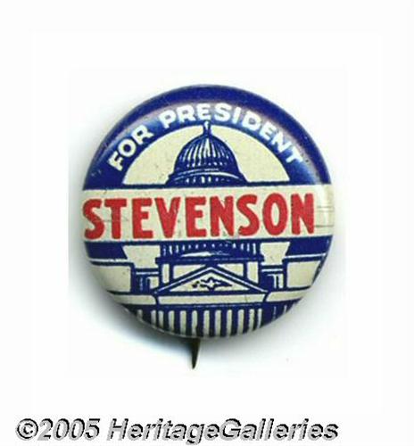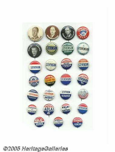 <B>Group Lot of 1952 and 1956 Adlai Stevenson Buttons</B></I> Twenty-six pieces as shown. Please see our web site for additional images. Nearly all in excellent or better condition. Total individual retail value around $100-$125. Lot:264