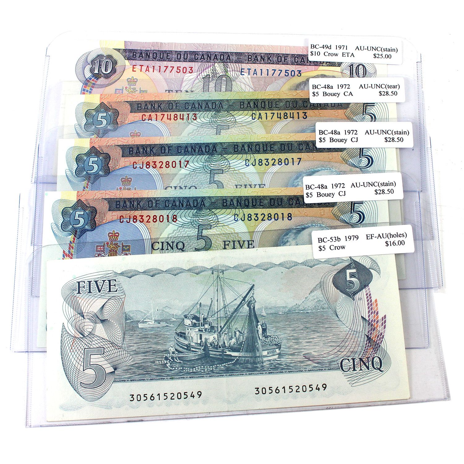 INCLUDES: BC-49d 1971 $10 AU-UNC(stain) SN: ETA1177503, BC-48a 1972 $5 AU-UNC(tear) SN: CA1748413, BC-48a 1972 $5 AU-UNC(stain) SN: CJ8328017 & CJ8328018, BC-53b 1979 $5 EF-AU(holes) SN: 30561520549. 5pcs.