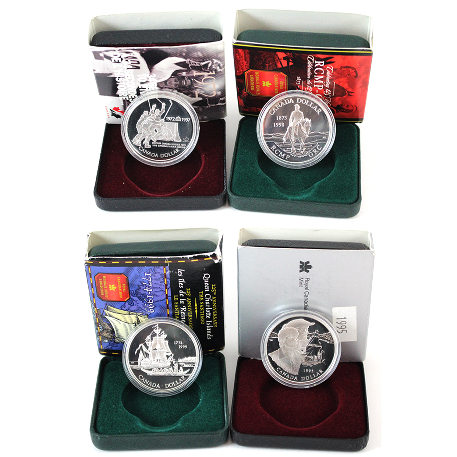 1995 Canada 325th Ann. Hudson's Bay Company, 1997 25th Ann. Canada/Russia Hockey, 1998 125th Ann. of the RCMP & 1999 225th Ann. of the Voyage of Juan Perez and the Sighting of the Queen Charlotte Islands. Scratched capsules, wear to outer sleeves and clamshells. 4pcs.