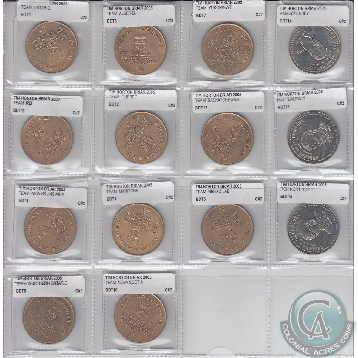 Group Lot of 2005 Tim Horton's Briar Canada team Tokens. Each coin contains 11 different teams & 3x Curlers of the Century Tokens: Ontario, Alberta, Yukon, PEI, Quebec, Saskatchewan, New Brunswick, Manitoba, NFLS & LAB, Northern Ontario & Nova Scotia. Curlers of the Century Randy Ferbey, Matt Baldwin & Ron Northcott. 33 mm in diameter. 10pcs