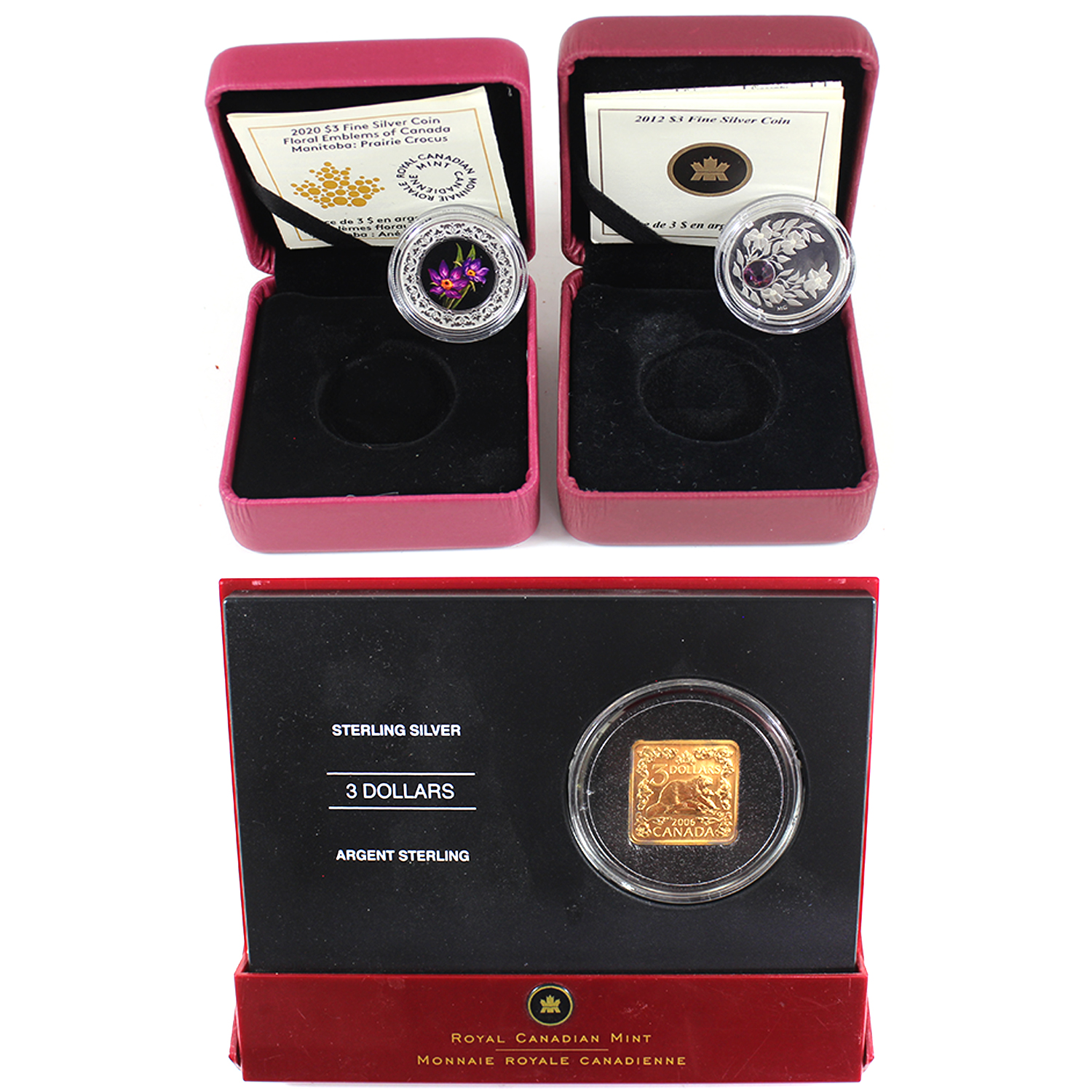 INCLUDES: 2006 Square Sterling Silver Coin: The Beaver, 2012 Birthstone Collection - February Fine Silver & 2020 Floral Emblems of Canada - Manitoba Prairie Crocus Fine Silver. No outer boxes; capsules may be scratched. Wear to cases. 3pcs