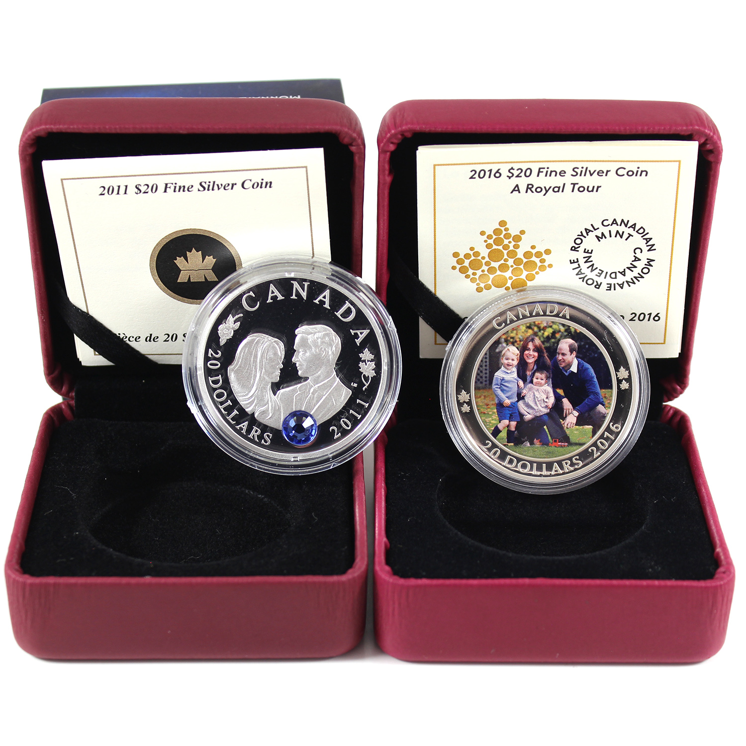 INCLUDES: 2011 Prince William and Kate Middleton Royal Wedding 1oz fine silver coin with a Swarovski Sapphire embellishment, & 2016 A Royal Tour 1oz fine silver coin featuring a full colour family portrait of the Duke and Duchess of Cambridge with their children. 2pcs. (Tax Exempt)
