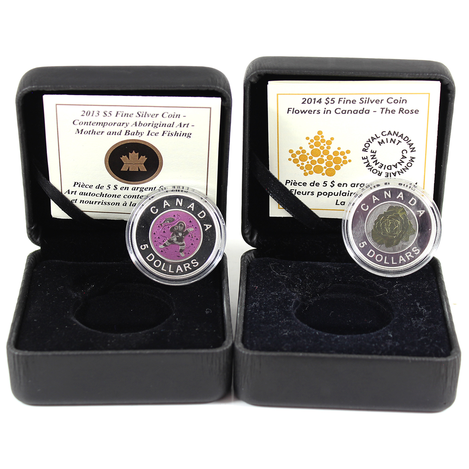 INCLUDES: 2013 Contemporary Aboriginal Art - Mother and Baby Ice Fishing w/ selective colour, & 2014 Flowers of Canada - The Rose w/ niobium plating. 2pcs. (Tax Exempt)