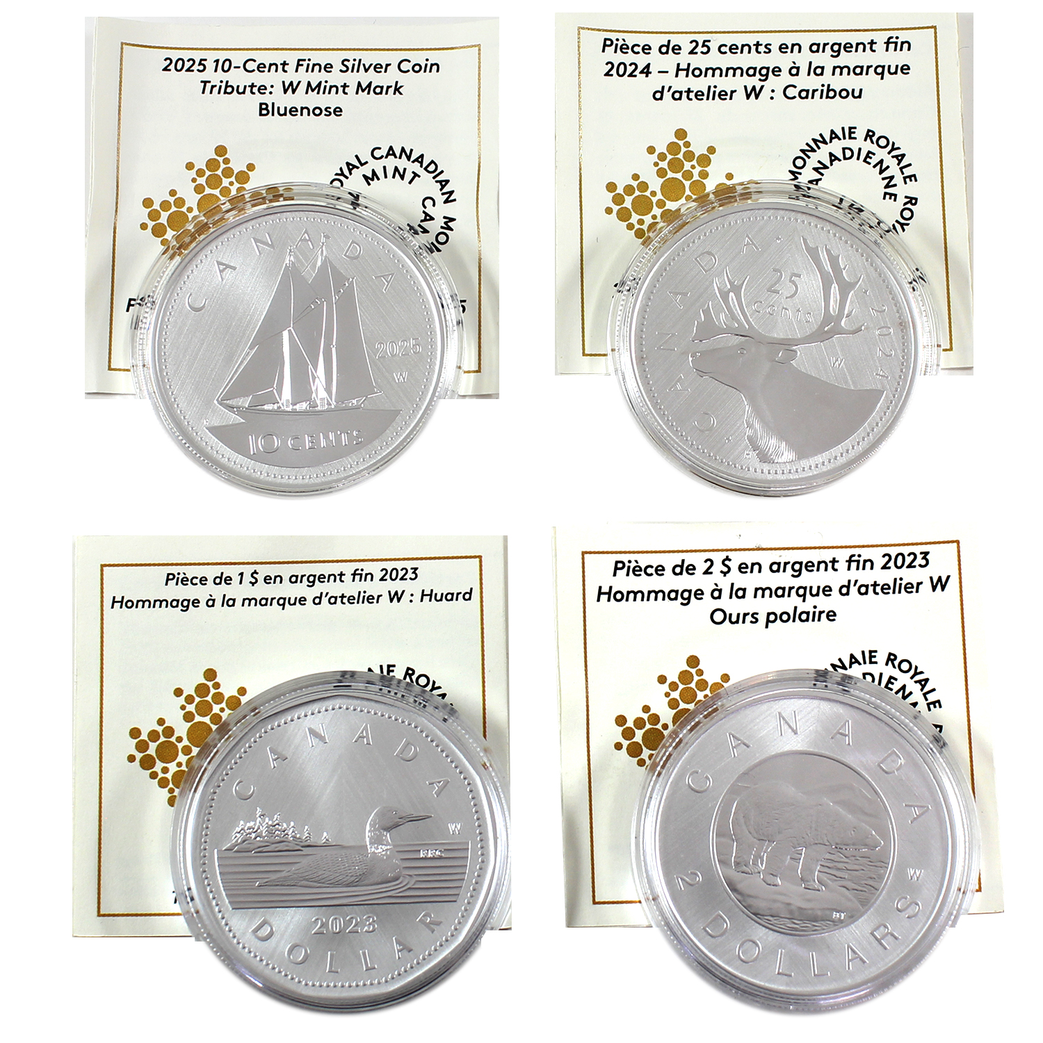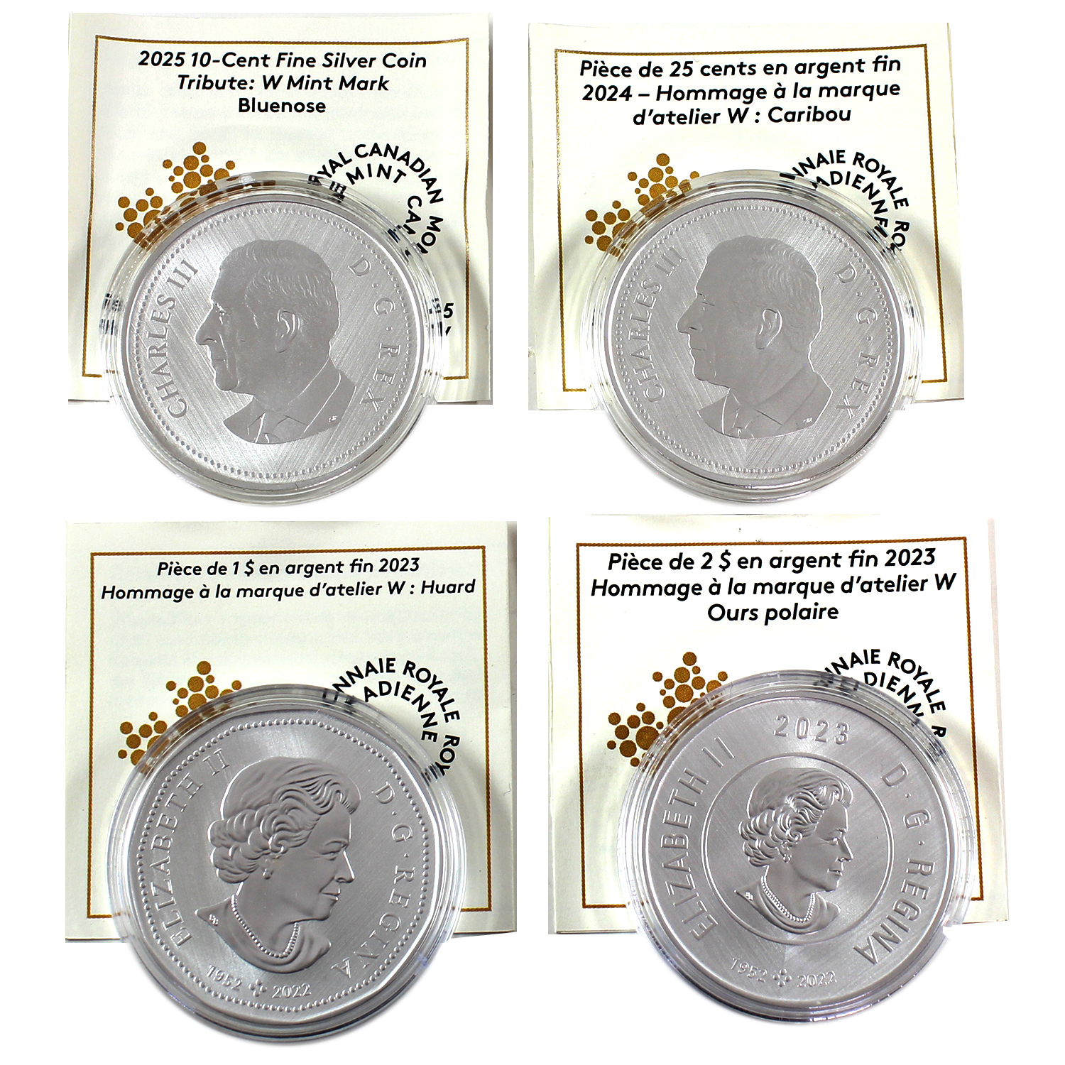 INCLUDES: 2023 $2 Polar Bear, 2023 $1 Loon, 2024 25-cent Caribou, & 2025 10-cent Bluenose. Each coin is 1oz and .9999 fine silver. 4pcs. (Tax Exempt)