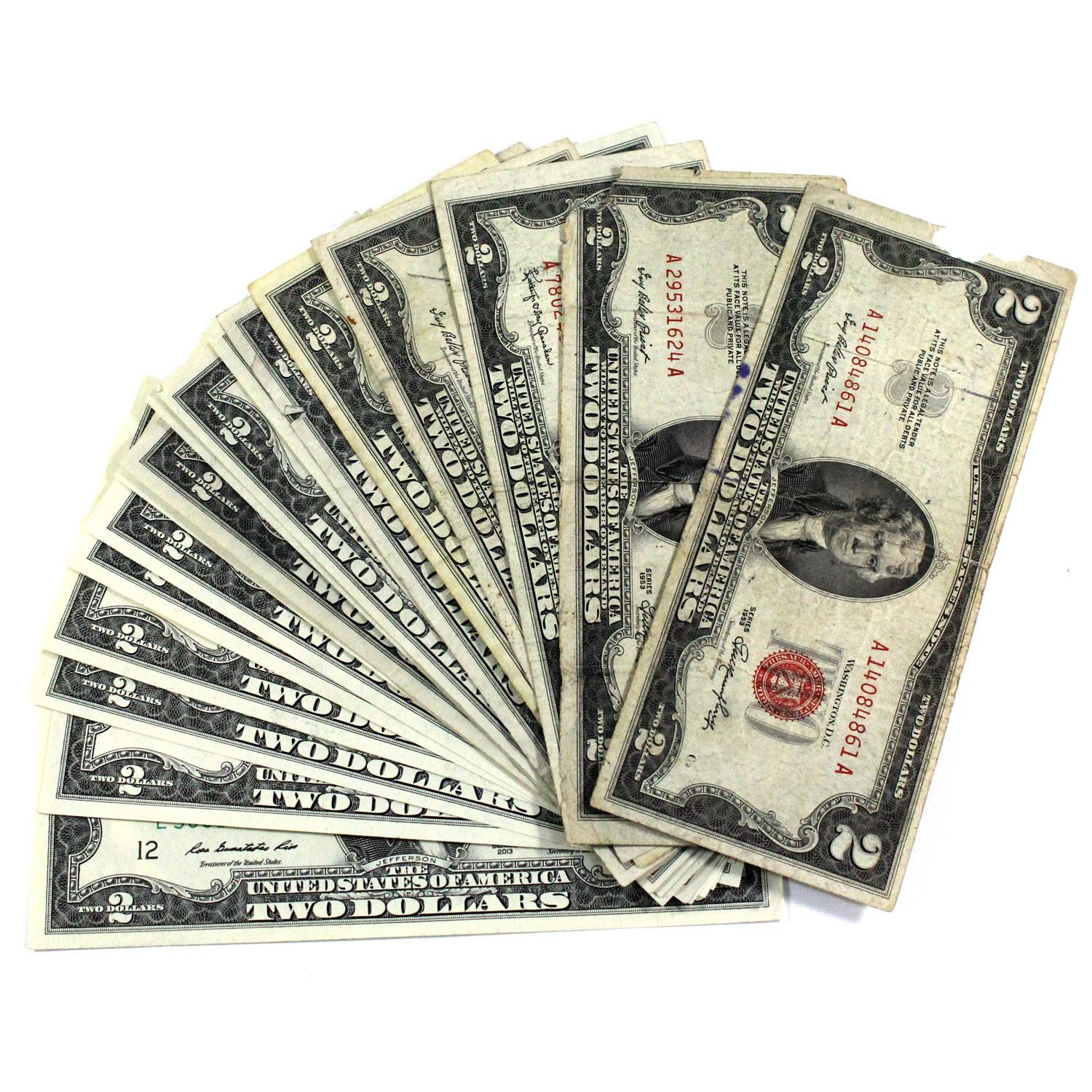 Group Lot of 22x USA $2 Banknotes - 4x 1953, 2x 1963, 9x 1976, 2x 2003 & 4x 2013. Some notes contain impairments. 22pcs