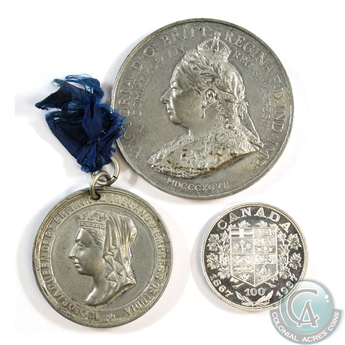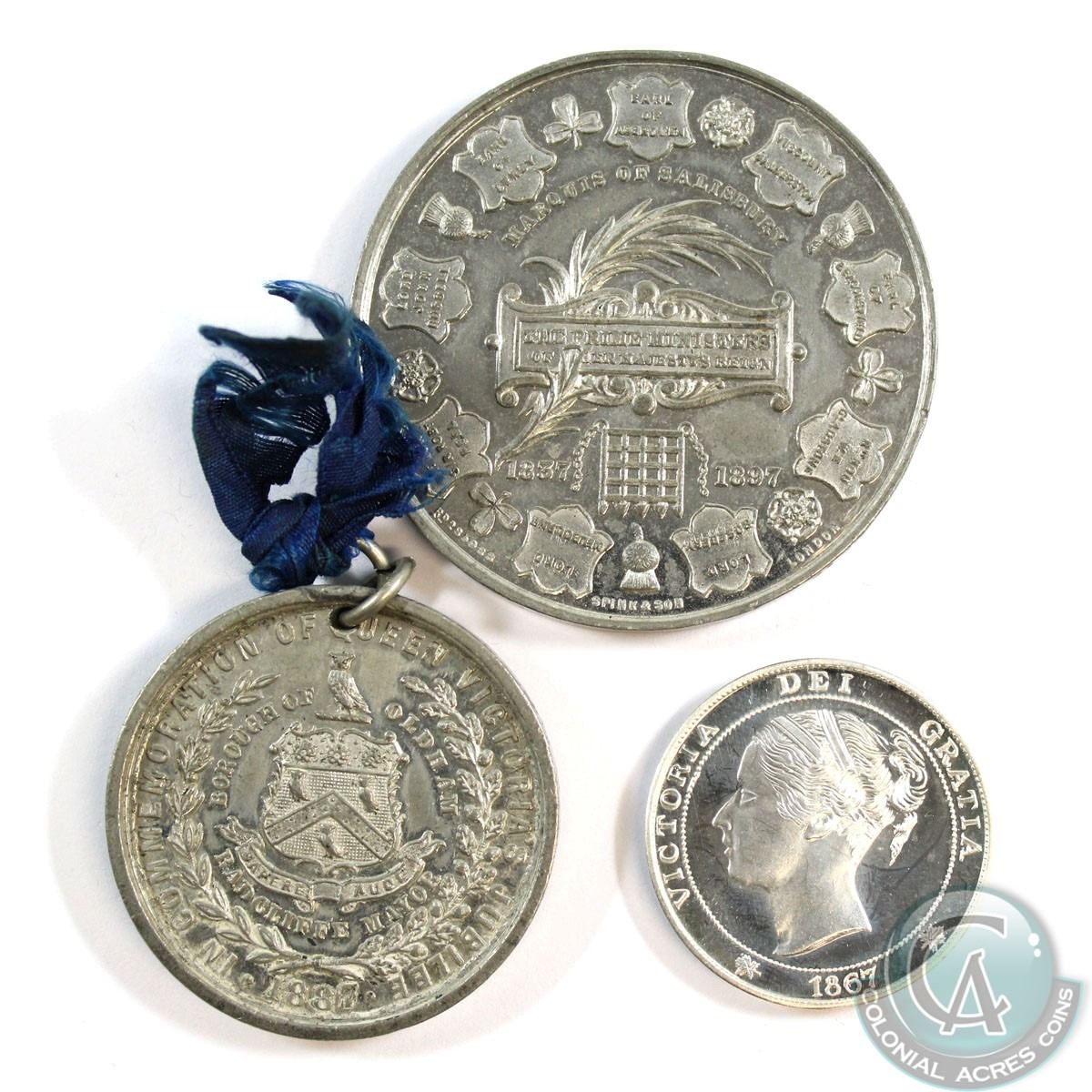 A Unique Lot featuring 3 different Medals of Queen Victoria. Lot includes the following medals: 1) 1887 Golden Jubilee Struck in White medal, (39mm-15.5g), Medal has been holed for ribbon mount. Obv. Legend: VICTORIA QUEEN OF Ct. BRITAIN & IRELAND & EMPRESS OF INDIA. Reverse: Outer- IN COMMEMORATION OF QUEEN ICTORIA'S Jubilee. Inner- BOROUGH OF OLDHAM RADCLIFFE MAYOR. 2) 1837-1897 Diamond Jubilee Medal Struck in White Metal Obverse featuring Bust of Queen Victoria, laureate, crowned, in low dress with orders. (50mm-40g) Obv. Legend: Outer-VICTORIA D:G: BRITT: REGINA F:D:IND:IMP Inner- IN COMMEMOR AN REG SEXAGESIMI Reverse: MARQUIS OF SALISBURY, THE PRIME MINITER'S OF HER MAJESTYS REIGN. 3) 1867-1967 Silver McTavis Medal featuring the young head of Queen Victoria on the Obverse and Coat of Amrs on the revers. (30mm- 13.7g) Medal is in UNC Condition.