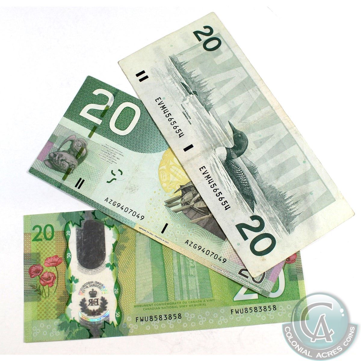 Group Lot of 3x RADAR $20.00 Notes, one 1991, one 2004 and one 2015. 3 pcs