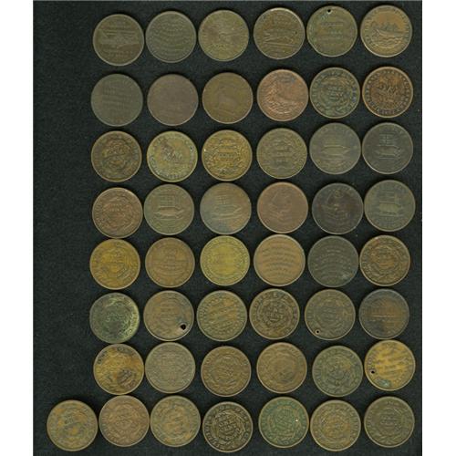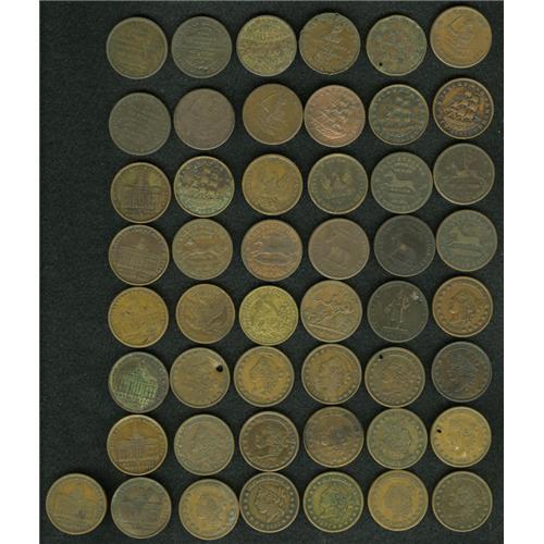 <B>Group Lot of 49 Miscellaneous Hard Times and Related Tokens, Uncertified.</B></I> The lot includes 49 copper and brass tokens.
