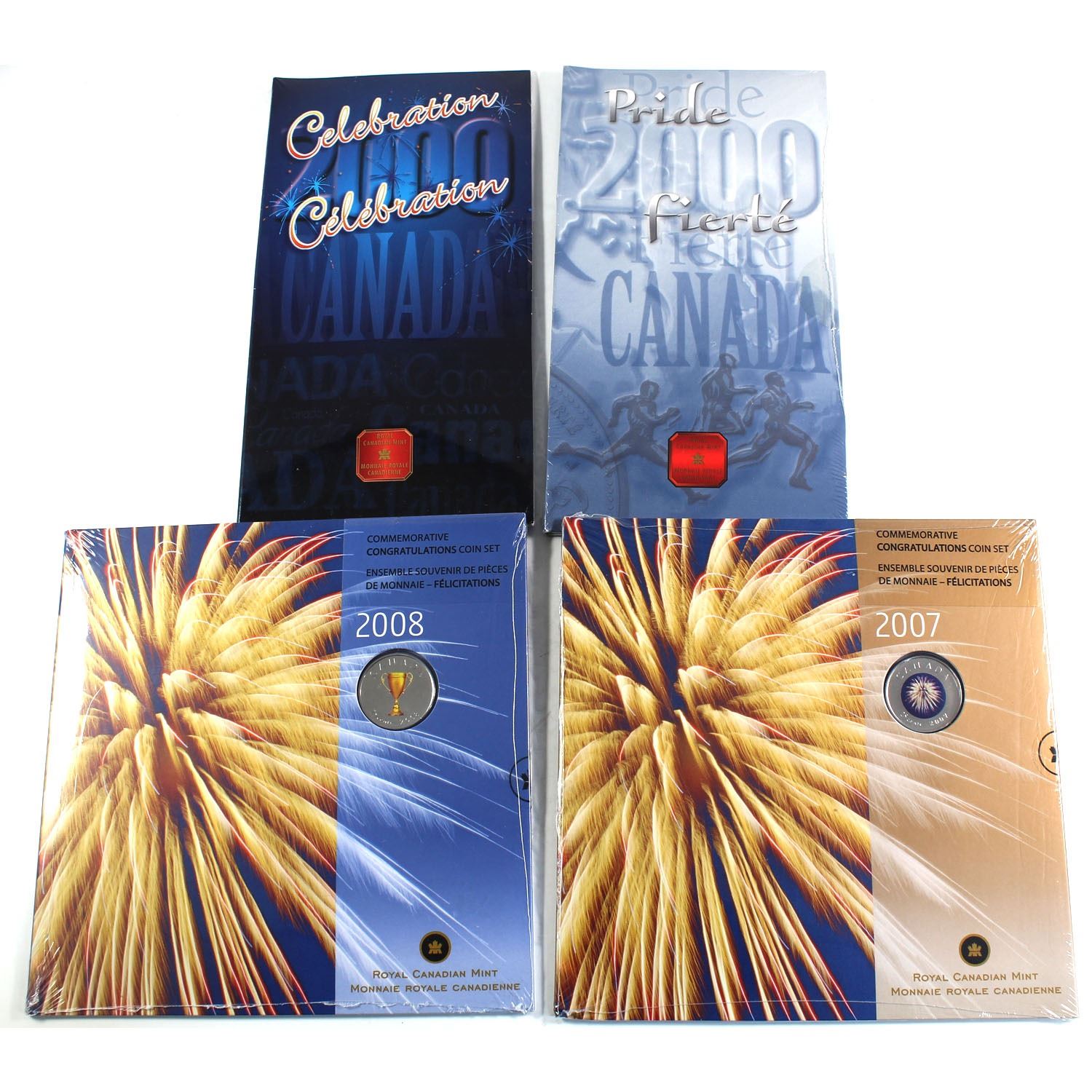 Group Lot of 4x Royal Canadian Mint Colourized Commemorative 25-cent in original sealed holders. Lot includes: 2000 Celebration, 2000 Pride, 2007 Congratulations (fireworks) Gift Set, & 2008 Congratulations Gift Set. 4pcs