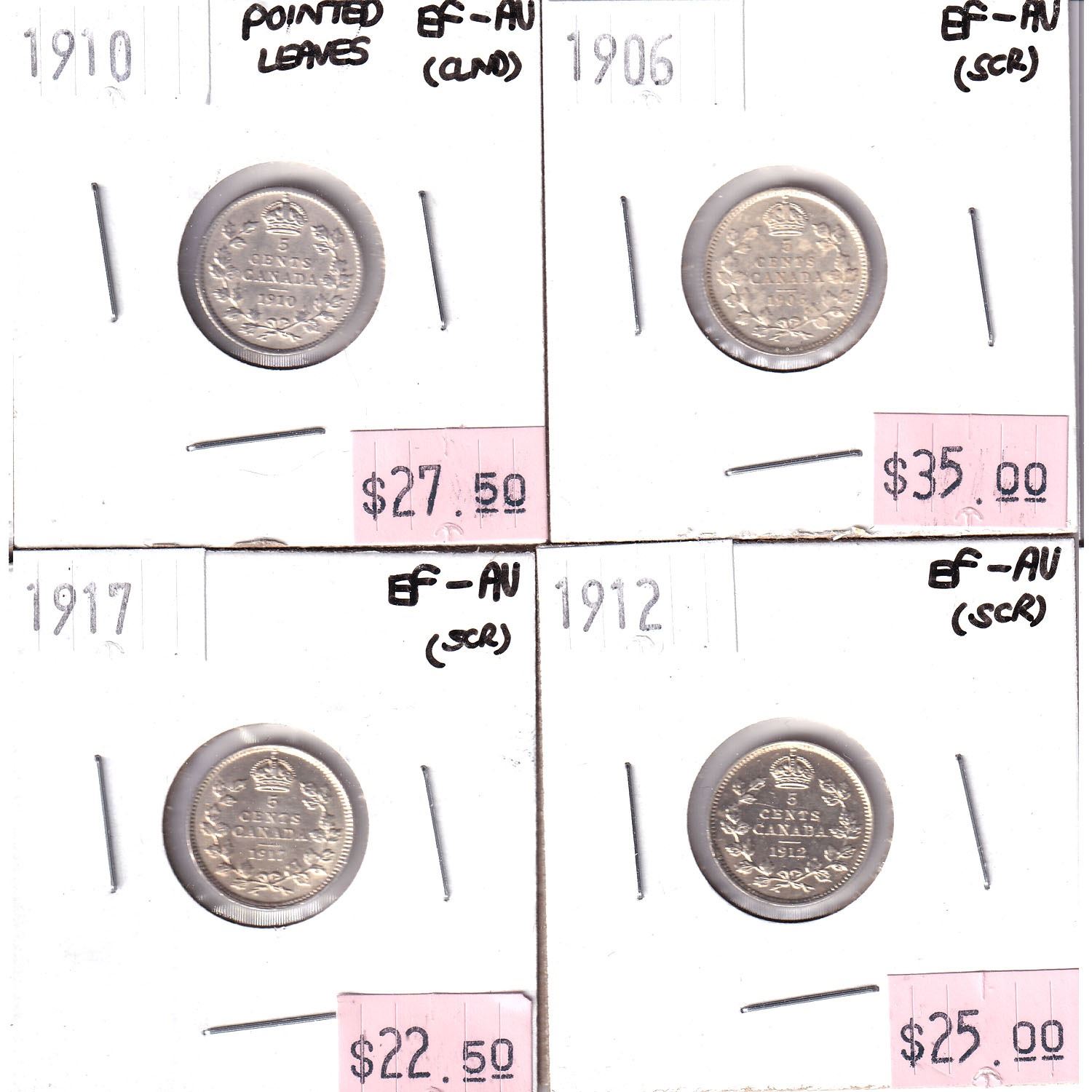 Group Lot of 4x Silver Canada 5-cents: 1906, 1910 Ptd Lvs, 1912, 1917. All coins EF-AU with some minor Scratches. 4pcs