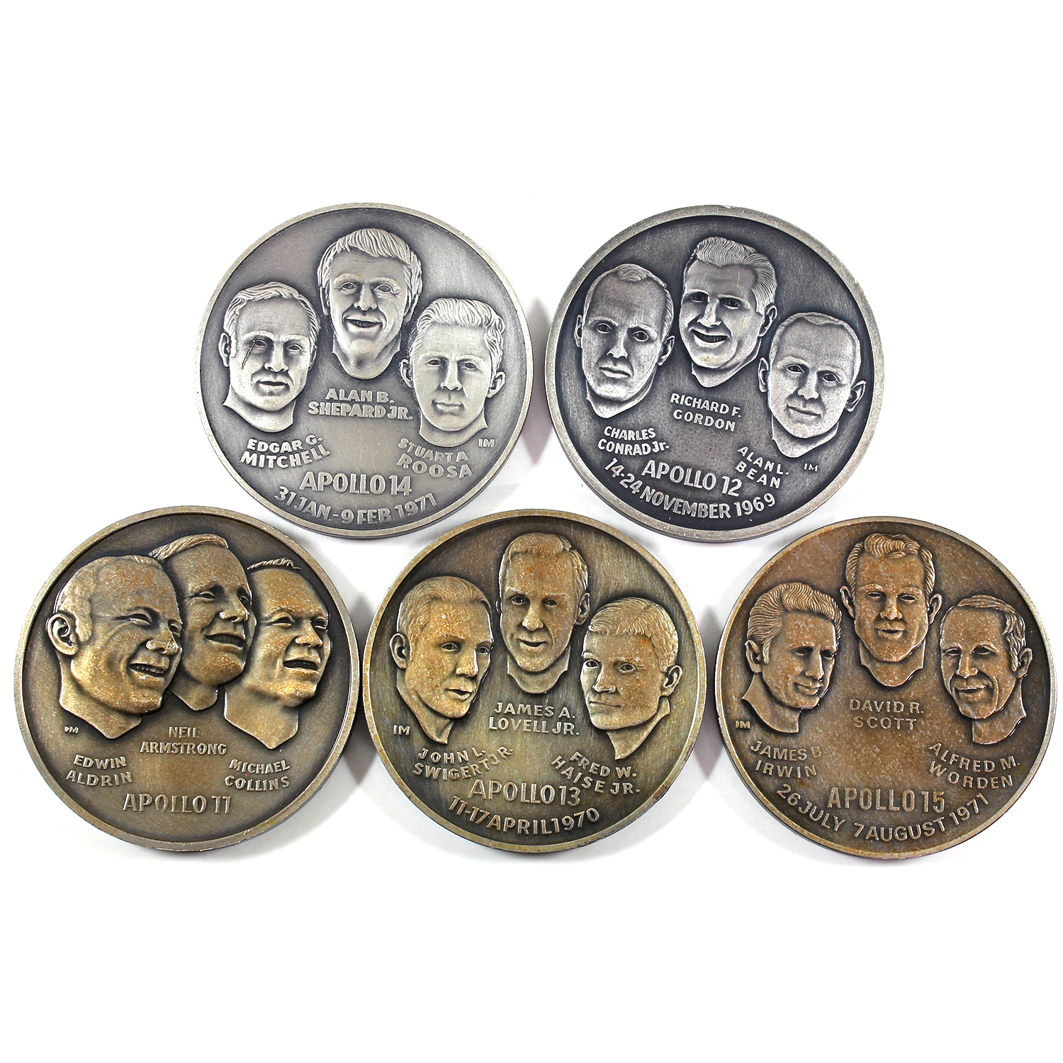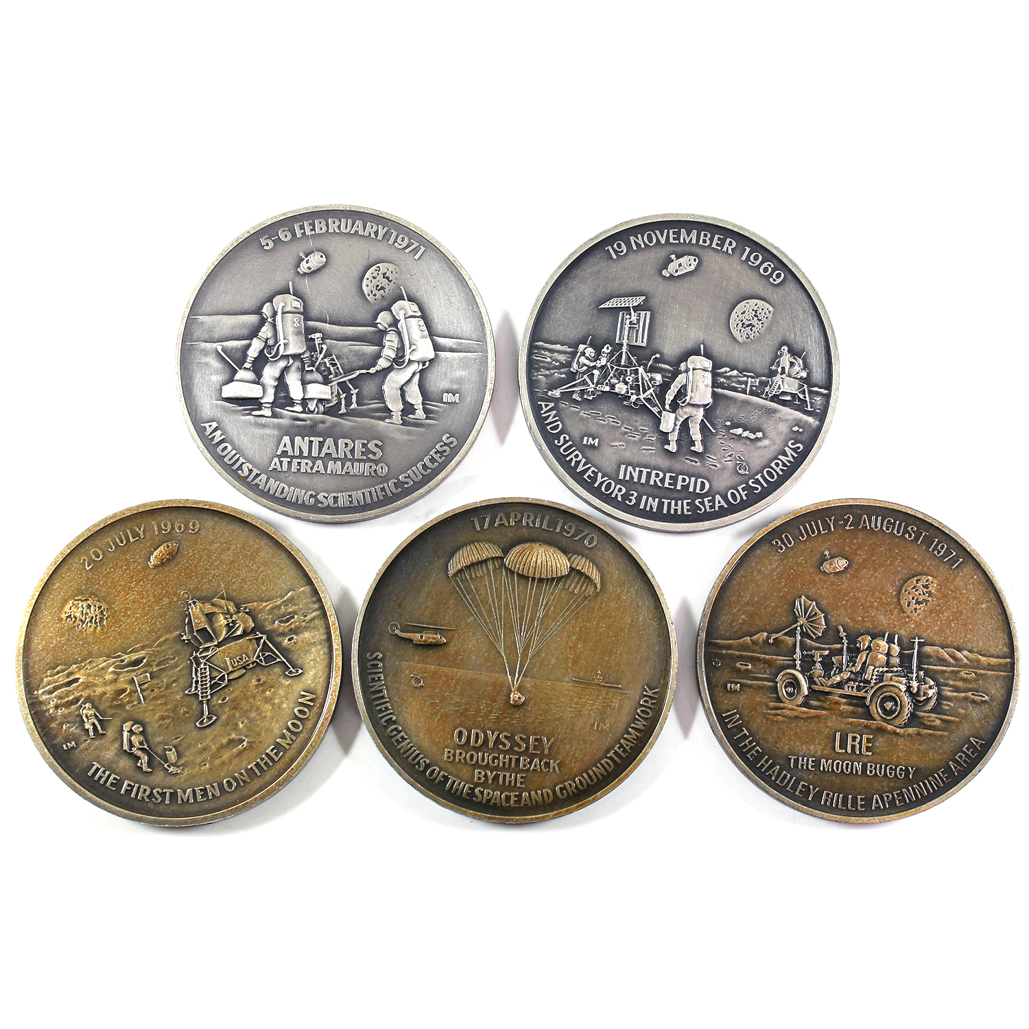 Two silver toned medals, XRF: 985.1 Silver, 1.45 Copper, 0.03 Zinc. Three bronze toned medals, XRF: 98.7 Silver, 1.3 Copper. 5pcs