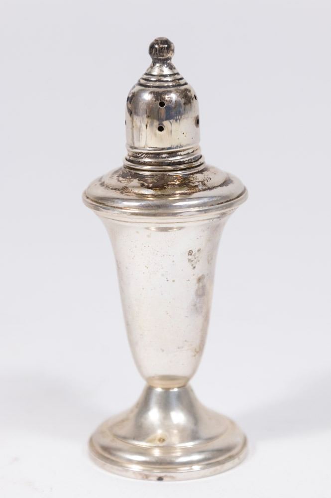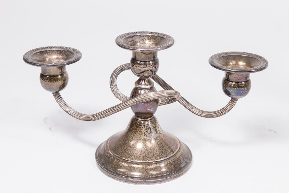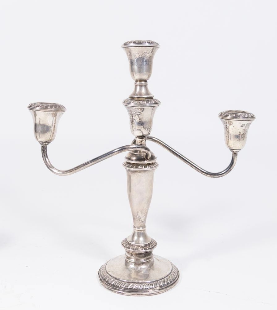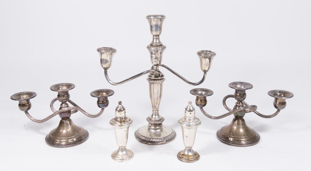 Including: pair of weighted 3-arm candelabra, pair of weighted sterling silver salt & pepper and 11" high 3-arm weighted candelabra. (6163)