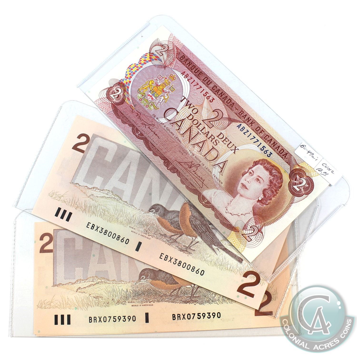Group Lot of 5x $2 Bank of Canada Notes. You will receive 1974 BC-47a-i prefix ABZ; AU-UNC, 1986 BC-55bA-i prefix EBX; CUNC & 3x BC-55bA with consecutive serial numbers - BRX0759390-92; CUNC. 5pcs total
