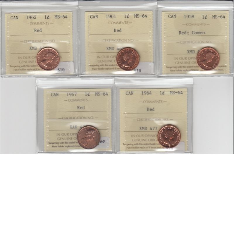 Group Lot of 5x Canada 1-cent ICCS Certified MS-64. Years Included: 1958, 1961, 1962, 1964 and 1967.