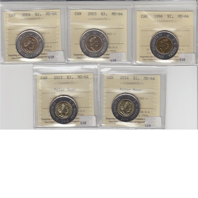Group Lot of 5x Canada $2 ICCS Certified MS-64. Years Included: 1996, 2003, 2004, 2014 and 2015.
