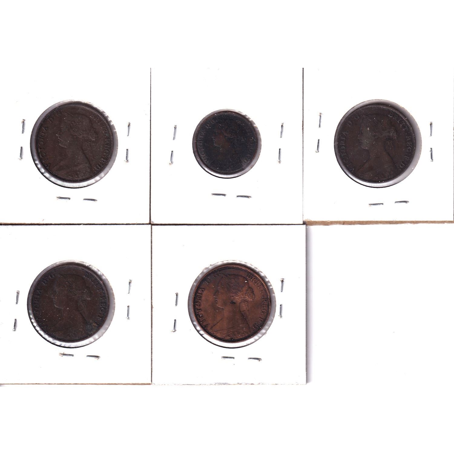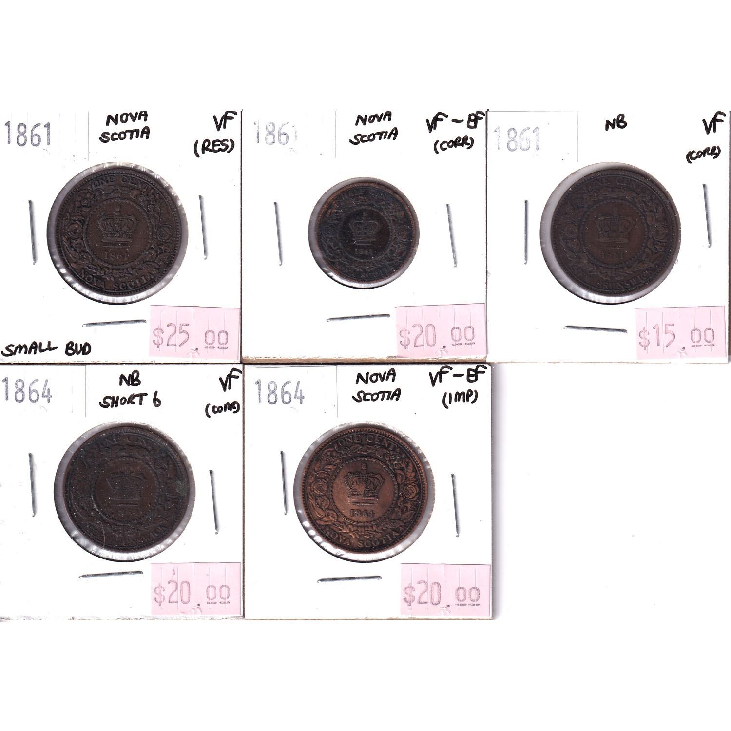 Group Lot of 5x Victorian Maritimes Copper. Lot includes: 1861 & 1864 Short 5 N.B Large 1-cent, & 1861 & 1964 N.S. Large Cents and a 1861 N.S. Half Cent. Coins are between VF-20 to VF-30 condition. Coins may be lightly cleaned or impaired. 5pcs