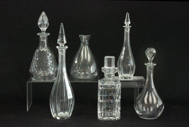 Including Baccarat, Lalique & Waterford. Tallest approx. 15" H. Damages to some stoppers.