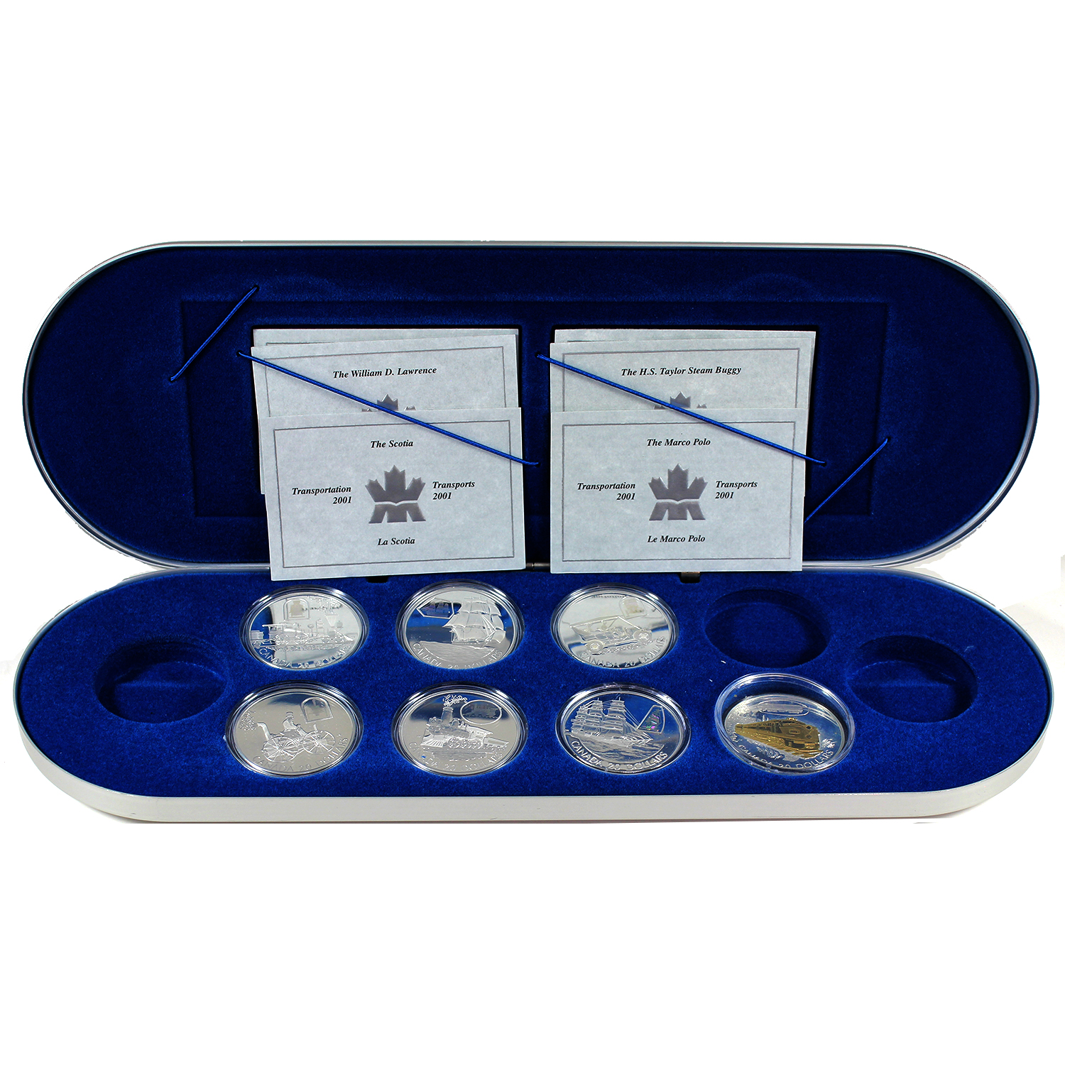 INCLUDES: 2000 Train - The Toronto, 2000 Car - HS Taylor, 2001 Ship - Marco Polo, 2001 Train - The Scotia, 2001 Car - Russell Light Four, 2002 Ship - William Lawrence & 2003 Train - CNR FA-1. Includes all COAs except 2003. Capsules scratched. Coins housed in case from the aviation series.