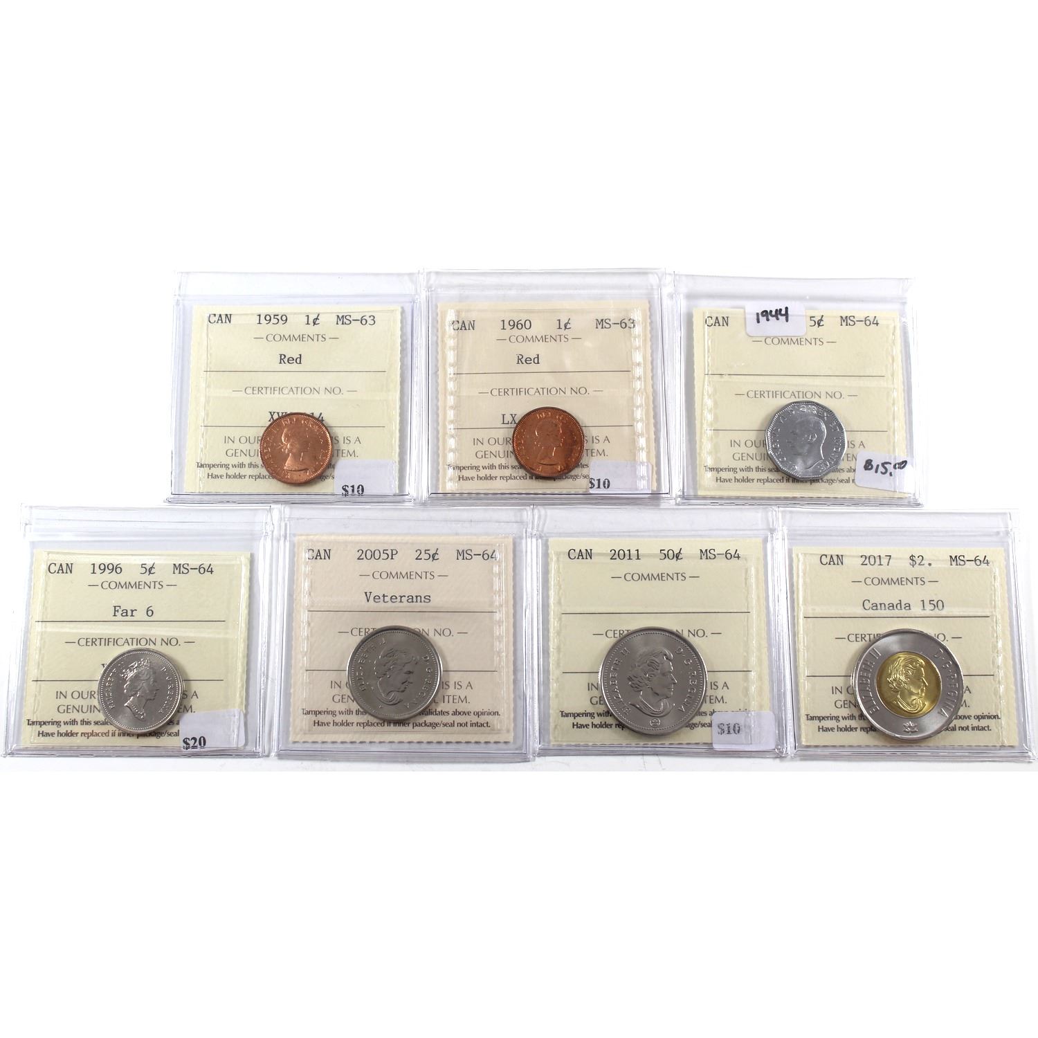 Group Lot of 7x Canadian ICCS Certified Coins all MS-63 & MS-64. Lot includes 1959 & 1960 1-cent both MS-63 RED, 1944 5-cent MS-64, 1996 5-cent Far 6 MS-64, 2005P 25-cent Veterans MS-64, 2011 50-cent MS-64, & 2017 Canada 150th $2 MS-64.