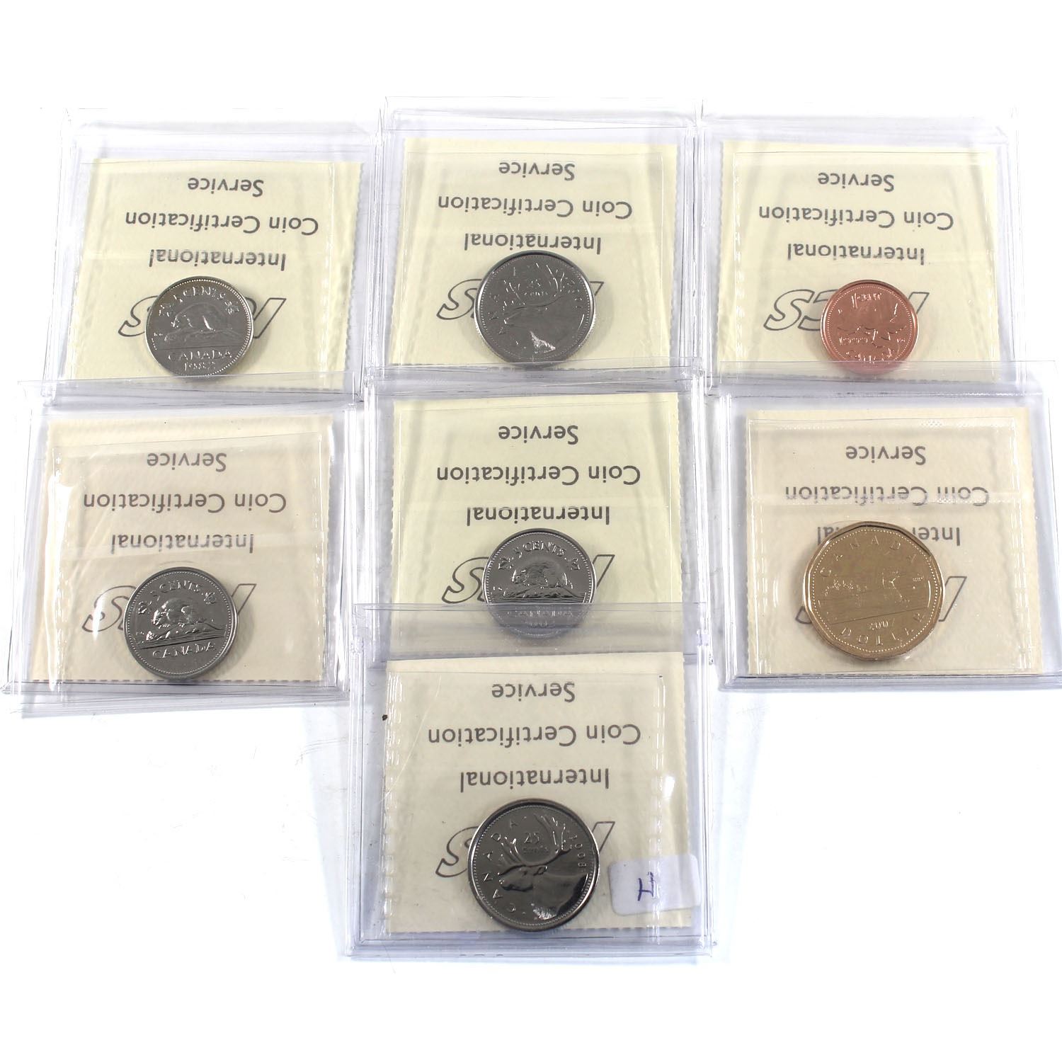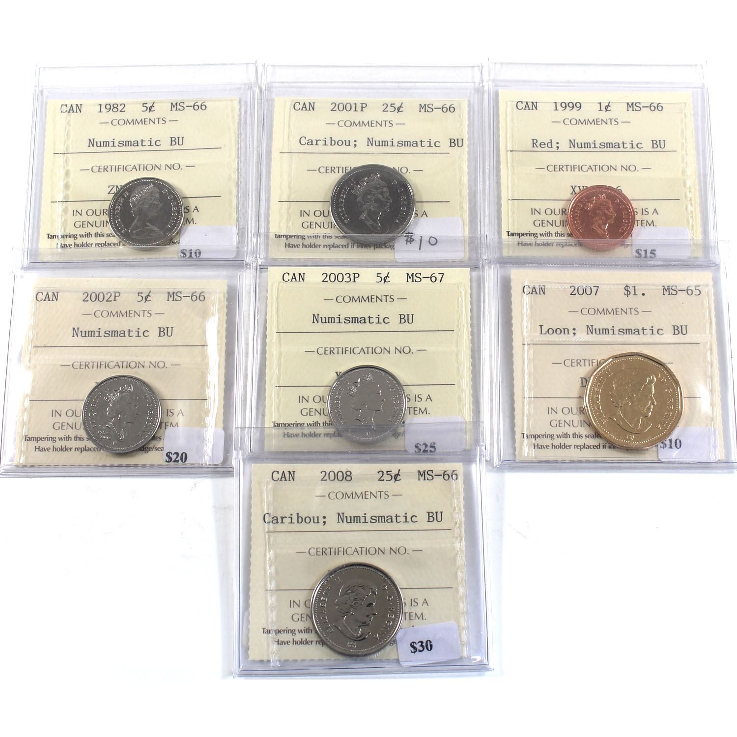 Lot Includes: 1982 5c MS-66, 2001P 25c MS-66, 1999 1c MS-66 RED, 2002P 5c MS-66, 2003P 5c MS-67, 2007 Loon MS-65, 2008 25c Caribou MS-66. All coins are NBU Strikes. 7pcs