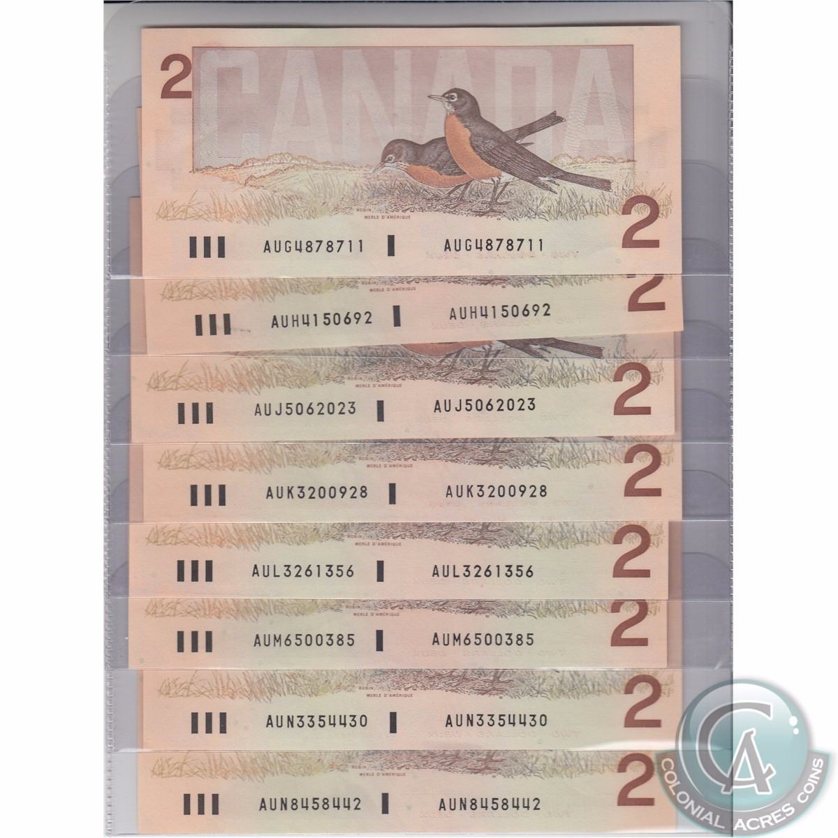 Group Lot of 8 Different 1986 Changeover $2.00 Notes with 8 Different Prefixes all in AU or better condition. Prefixes AUG, AUH, AUJ, AUK, AUL, AUM, AUN(C-B) and AUN(T-C)