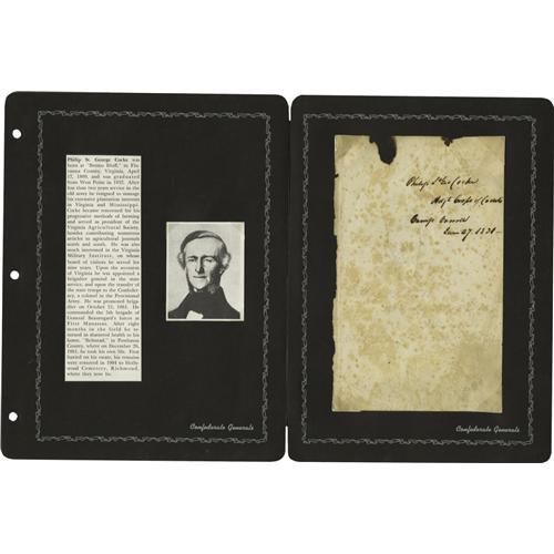 <B>Group Lot of Nine Confederate Generals' Autographs</B></I> consisting of:<BR><B>James Holt Clanton</B></I>- Clipped signature with name below. Clanton was murdered in 1871 by a drunken Federal officer.<BR><B>Charles Clark</B></I>- 1871 ALS.<BR><B>Henry DeLemar Clayton</B></I>- Clipped endorsement with rank, from a Civil War military document.<BR><B>T. L Clingman</B></I>- 1886 ALS.<BR><B>Phillip St. George Cocke</B></I>- 1831 autograph page as Adjt. Of the Corps of Cadets at West Point.<BR><B>Francis M. Cockrell</B></I>- Autograph card with "<I>Missouri</B></I>" below.<BR><B>Alfred H. Colquitt</B></I>- Clipped signature. Later governor of Georgia and U. S. senator. Mounted with original CDV.<BR><B>R. E. Colston</B></I>- Two page 1886 ALS.<BR><B>James Conner</B></I>- 1882 ALS.<BR><BR><b>Shipping:</b> Small Flat (<a target="_blank" href="http://www.heritageauctions.com/common/shipping.php">view shipping information</a>)
