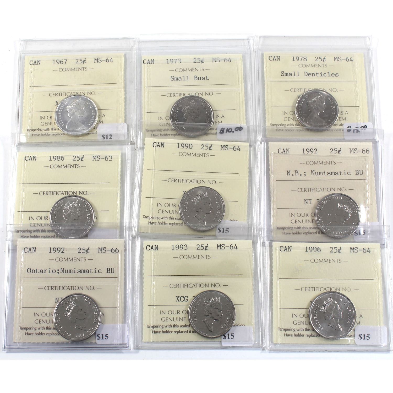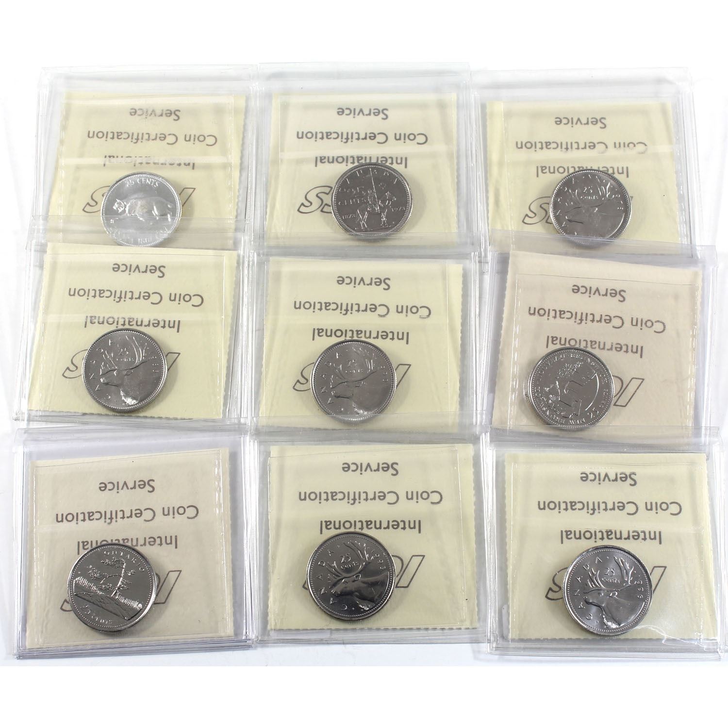 Lot includes: 1967 MS-64, 1973 Sm Bust MS-64, 1978 Sm Denticles MS-64, 1986 MS-63, 1990 MS-64, 1992 N.B. MS-66 NBU, 1992 Ontario MS-66 NBU, 1993 MS-64, & 1996 MS-64. 9pcs